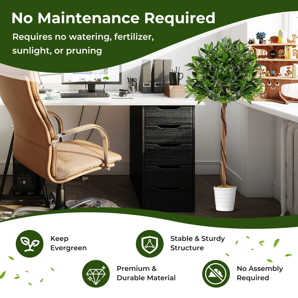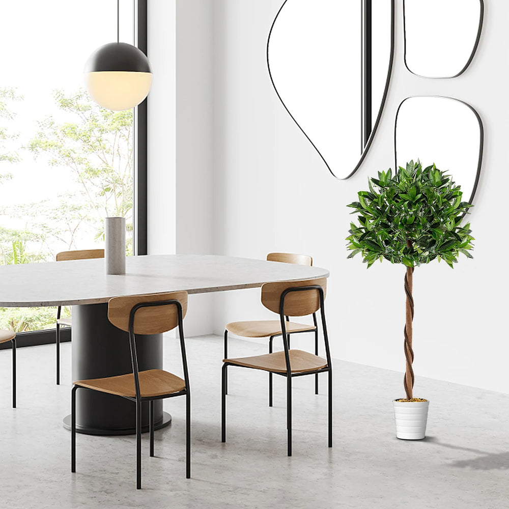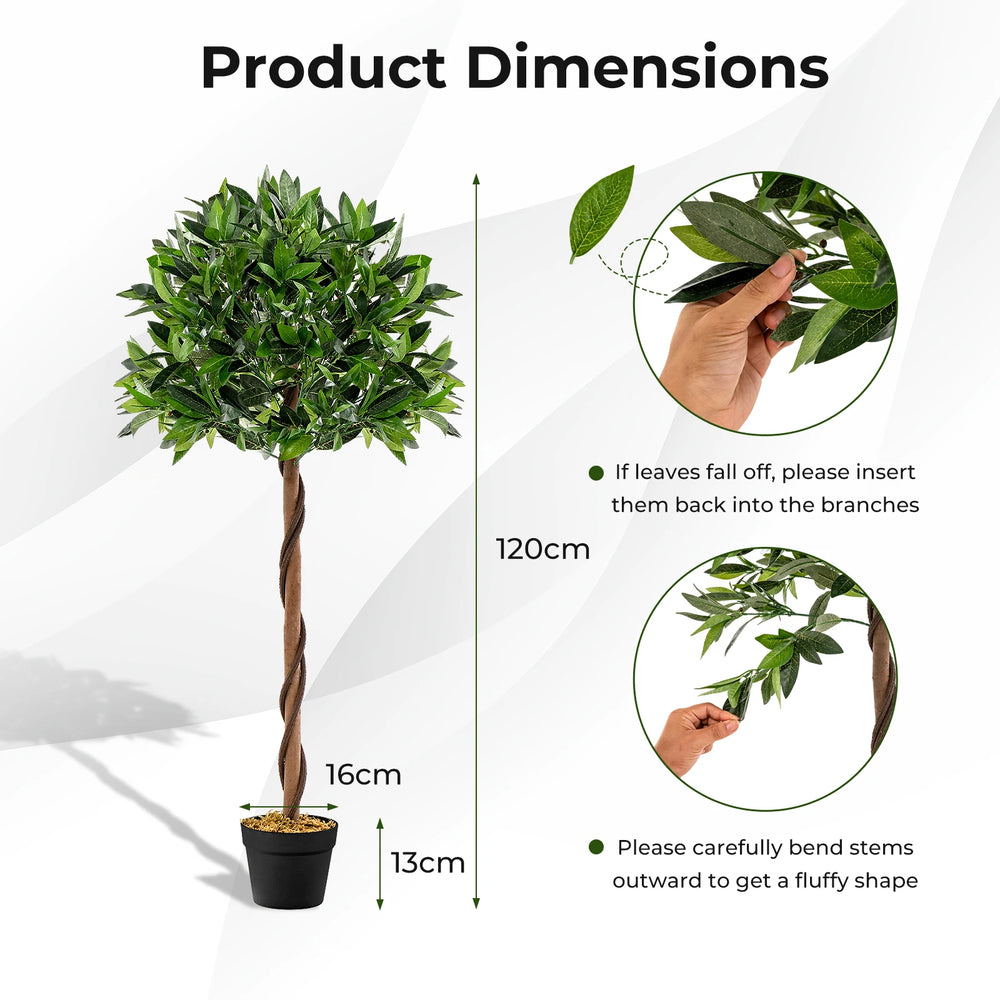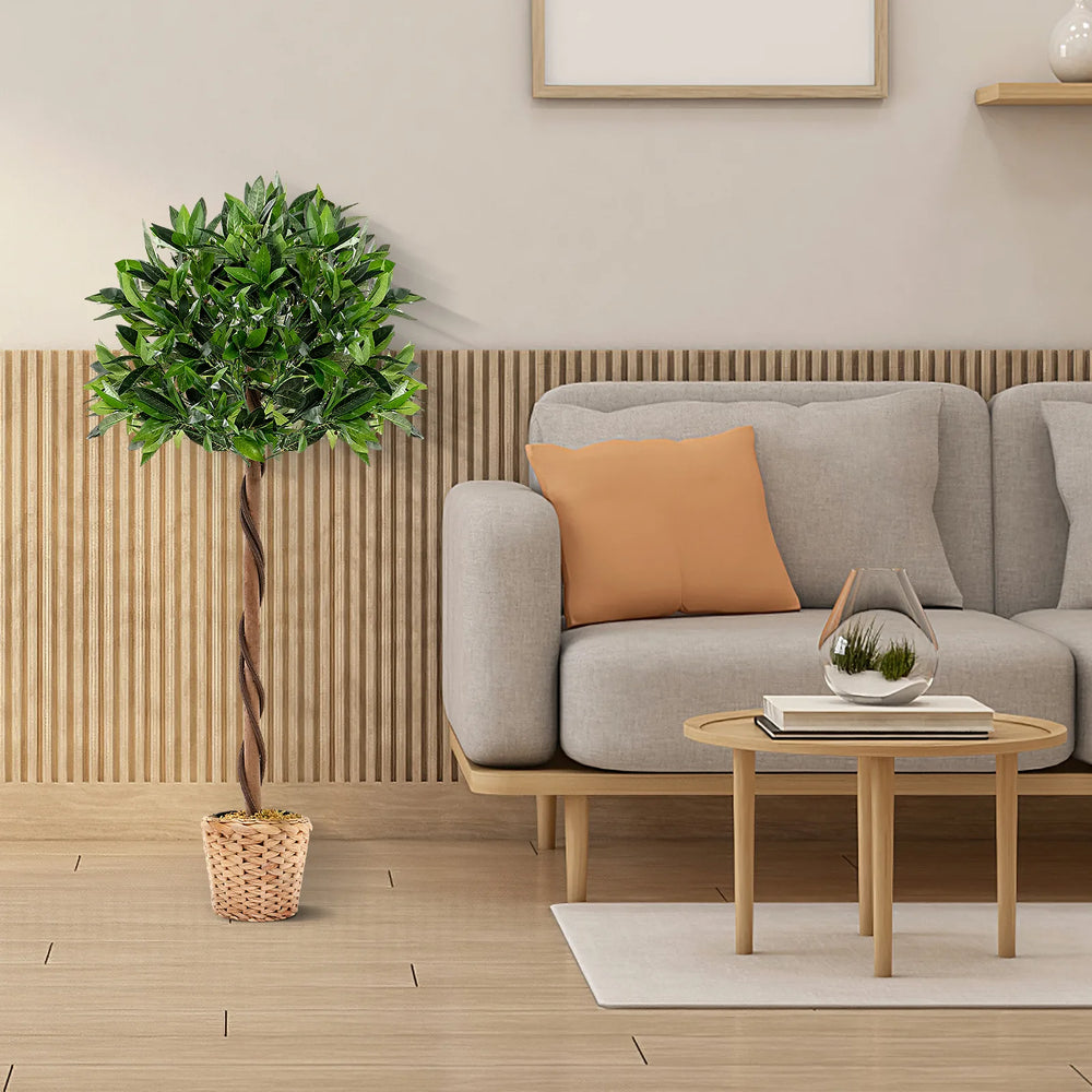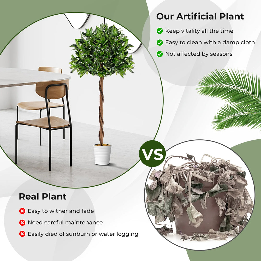 Add Natural Elegance to Your Living Space! Bring the beauty of the outdoors into your indoor space with the exquisite fake bay laurel tree. Featuring 741 verdant leaves that closely mimic the appearance of a real bay laurel tree, this stunning decoration is a visual delight. Crafted with meticulous attention to detail, it boasts simulated PE rattans and a natural wood trunk or an authentic look. Other than that, the leaves are crafted of premium polyester fabric, ensuring durability and a luxurious feel. And its sturdy pot with built-in cement provides stability and a solid structure. In contrast to the real tree, the fake tree requires no prune, water, shape, or apply fertilizer on it, keeping green all the seasons. Whether for home or office use, this versatile tree suits multiple decorative settings beautifully. Vivid and Full-Bodied Appearance: The artificial tree features 741 verdant leaves, simulated PE rattans, and a natural wood trunk, which mimics the appearance of a real bay laurel tree, bringing elegance and charm to your home. Besides, it is adorned with realistic moss on the pot. Premium and Durable Material: The faux bay laurel tree adopts premium polyester fabric leaves, which are non-odor and non-allergic, ensuring safe use. Moreover, it is resistant to fading, discoloration, and damage from sunlight, ensuring long-lasting beauty. Stable and Sturdy Structure: The fake potted bay laurel tree is supported by a sturdy pot with built-in cement, keeping the tree upright and stable all the time. Note: we suggest placing it in a bigger decorative planter to personalize your own decoration. Evergreen Artificial Tree: In contrast to real plants that are easy to wither and fade while needing careful maintenance, the artificial plants keep vitality all the time and require no watering, sunlight, or fertilizer. Besides, just use a clean cloth to wipe them for daily cleaning. Versatile Decoration: The 120 cm fake bay laurel tree is suitable for various occasions, such as homes, offices, porches, stores, and more, adding timeless beauty and elegance to your living space. Moreover, the modern artificial tree can also be a perfect housewarming gift for neighbors or friends.