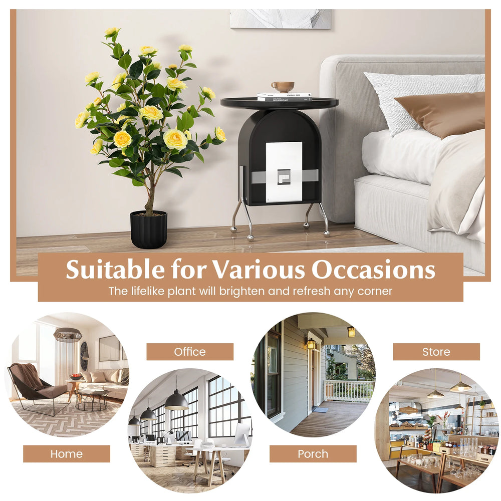 38 Inch Artificial Camellia Tree Faux Flower Plant in Cement Pot-Yellow