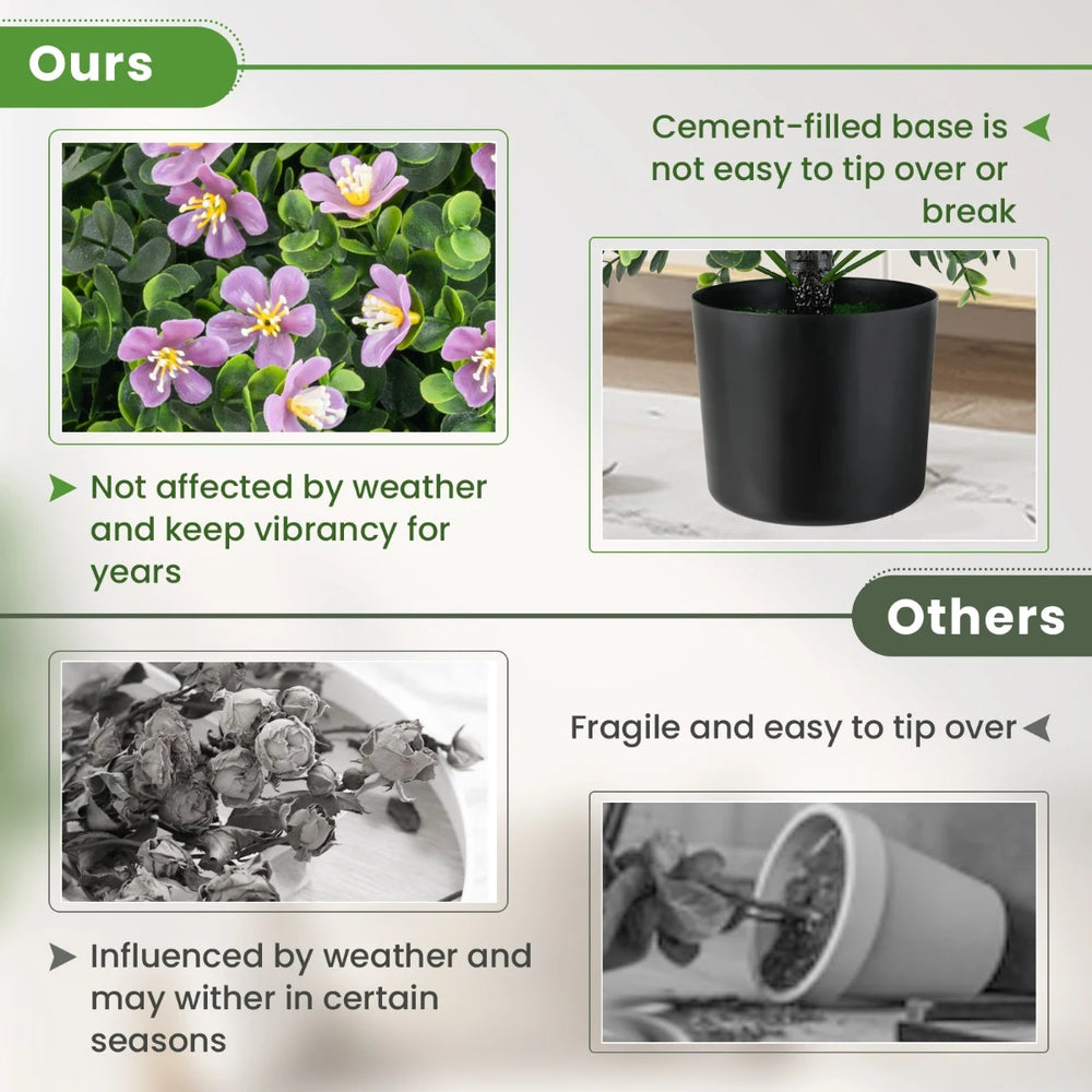 Labor-saving greenery for your living space! The ball shape faux plant features vivid white/purple flowers intricately scattered among gradient green leaves, mimicking the beauty of real flora. The realistic textured branches and dense faux grass create a striking visual impact. The high-quality PE material utilized in our artificial topiary plants is chosen for its non-fading and sun-proof characteristics, making it perfect for outdoor spaces. Moreover, the material is completely smell-free for indoor decoration. With a cement-filled pot, the fake plant is not easy to wobble. The flexible branches allow for effortless adjustments, ensuring that you can easily shape the potted faux shrub plant to the best display state. Additionally, minimal maintenance is required to keep the plants looking fresh and vibrant, saving you time and effort. Coming in to set of 2, the potted artificial plants are ideal for embellishing spaces such as front porches, restaurants, homes, and more. Bullet Point: Lifelike Artificial Potted Plants: The ball shape faux plant is adorned with vivid white/purple flowers and gradient green leaves, which mimic the allure of natural vegetation. Additionally, the simulated branches and dense faux grass create a visually captivating display that is sure to impress. Sun-proof PE Material: The artificial topiary plants are made of high-quality PE material that is non-fading and sun-proof, making it applicable to outdoors. Additionally, the PE material is safe for indoor use without any unpleasant scents. Sturdy Cement-poured Pot: The flower pot of our fake greenery is filled with cement, providing stability and ensuring that the tree remains upright even in the face of minor impacts. For outdoor settings, we recommend pairing the plant with weighted planters to prevent toppling. Easy Maintenance: Unlike real plants that are influenced by weather and may wither in certain seasons, our artificial boxwood topiary ball tree will maintain its vividness without the need of watering or sunlight. Note: If individual leaves fall off, they can be reinserted. Enhance the Style of Any Settings: The set of 2 potted plants will add a touch of nature-inspired charm wherever they are placed, such as welcoming front porches, homes, and trendy restaurants. You can gently manipulate the head of the tree and adjust the leaves to the best display state. Specifications: Colour: Green & White & Black/ Green & Purple & Black Material: PE, PP, Cement Overall Height: 54 cm Flower Pot Height: 12.5 cm Flower Pot Diameter: 15 cm Overall Net Weight: 6 kg Package Includes: 2 x Artificial Boxwood Topiary Ball Tree