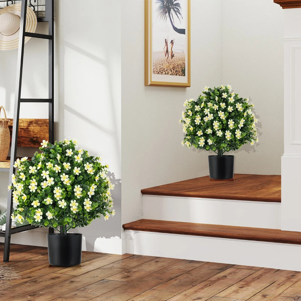 Labor-saving greenery for your living space! The ball shape faux plant features vivid white/purple flowers intricately scattered among gradient green leaves, mimicking the beauty of real flora. The realistic textured branches and dense faux grass create a striking visual impact. The high-quality PE material utilized in our artificial topiary plants is chosen for its non-fading and sun-proof characteristics, making it perfect for outdoor spaces. Moreover, the material is completely smell-free for indoor decoration. With a cement-filled pot, the fake plant is not easy to wobble. The flexible branches allow for effortless adjustments, ensuring that you can easily shape the potted faux shrub plant to the best display state. Additionally, minimal maintenance is required to keep the plants looking fresh and vibrant, saving you time and effort. Coming in to set of 2, the potted artificial plants are ideal for embellishing spaces such as front porches, restaurants, homes, and more. Bullet Point: Lifelike Artificial Potted Plants: The ball shape faux plant is adorned with vivid white/purple flowers and gradient green leaves, which mimic the allure of natural vegetation. Additionally, the simulated branches and dense faux grass create a visually captivating display that is sure to impress. Sun-proof PE Material: The artificial topiary plants are made of high-quality PE material that is non-fading and sun-proof, making it applicable to outdoors. Additionally, the PE material is safe for indoor use without any unpleasant scents. Sturdy Cement-poured Pot: The flower pot of our fake greenery is filled with cement, providing stability and ensuring that the tree remains upright even in the face of minor impacts. For outdoor settings, we recommend pairing the plant with weighted planters to prevent toppling. Easy Maintenance: Unlike real plants that are influenced by weather and may wither in certain seasons, our artificial boxwood topiary ball tree will maintain its vividness without the need of watering or sunlight. Note: If individual leaves fall off, they can be reinserted. Enhance the Style of Any Settings: The set of 2 potted plants will add a touch of nature-inspired charm wherever they are placed, such as welcoming front porches, homes, and trendy restaurants. You can gently manipulate the head of the tree and adjust the leaves to the best display state. Specifications: Colour: Green & White & Black/ Green & Purple & Black Material: PE, PP, Cement Overall Height: 54 cm Flower Pot Height: 12.5 cm Flower Pot Diameter: 15 cm Overall Net Weight: 6 kg Package Includes: 2 x Artificial Boxwood Topiary Ball Tree