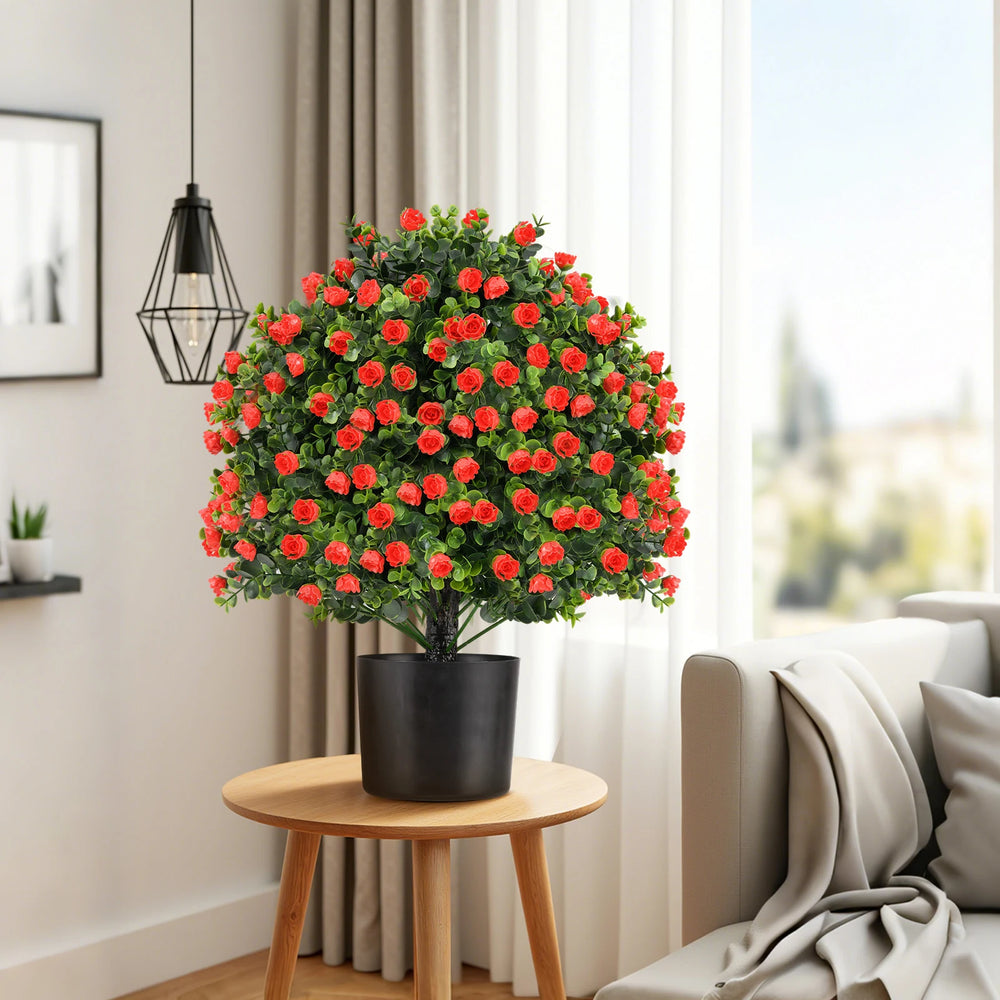 Impressive decoration for various settings! The simulated red roses are delicately scattered among the green leaves, creating a captivating display that breathes life into any space. Also, the realistic branches and dense faux grass create a striking visual impact. The high-quality PE material utilized in our lifelike artificial potted plants is chosen for its non-fading and sun-proof characteristics, making it perfect for outdoor spaces. Moreover, the material is smell-free for indoor decoration. With a cement-filled pot, the fake plant is not easy to wobble. The flexible branches allow for effortless adjustments, ensuring that you can easily shape the potted faux shrub plant to the best display state. Unlike real plants, the artificial tree requires no sunlight and no watering. Moreover, these potted fake plants will not affected by climate and keep vibrancy for years. Coming in to set of 2, the potted artificial plants are ideal for embellishing spaces such as front porches, restaurants, homes. Bullet Point: Lifelike and Vivid Design: The ball shape bushes with lifelike roses and gradient green leaves will add a pop of color to your space. Additionally, the realistic textured trunk and dense grass of our artificial plants mimic the intricate details found in nature. Sun-proof PE Material: The artificial topiary plants are made of high-quality PE material that is non-fading and sun-proof, making it applicable to outdoors. Additionally, the PE material is safe for indoor use without any unpleasant scents. Sturdy Cement-poured Pot: The flower pot of our fake greenery is filled with cement, providing stability and ensuring that the tree remains upright even in the face of minor impacts. For outdoor settings, we recommend pairing the plant with weighted planters to prevent toppling. No Trivial Maintenance: Unlike real plants, our artificial rose topiary ball tree will not affected by weather and temperature. Furthermore, it will maintain its vividness without the need of watering or sunlight. Note: If individual leaves fall off, they can be reinserted. Enhance the Style of Any Settings: The set of 2 potted plants will add a touch of nature-inspired charm wherever they are placed, such as welcoming front porches, homes, and trendy restaurants. You can gently manipulate the head of the tree and adjust the leaves to the best display state. Specifications: Colour: Green & Red & Black Material: PE, PP, Cement Overall Height: 54 cm Flower Pot Height: 12.5 cm Flower Pot Diameter: 15 cm Overall Net Weight: 6 kg Package Includes: 2 x Artificial Ball-shape Tree