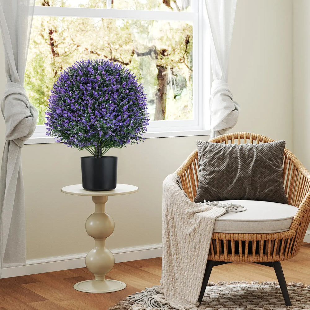 Labor-saving greenery for your living space! Why choose our artificial lavender ball tree? The simulated lavender blossoms are delicately scattered among the green leaves, creating a captivating display that breathes life into any space. Also, the realistic branches and dense faux grass create a striking visual impact. The high-quality PE material utilized in our artificial topiary plants is chosen for its non-fading and sun-proof characteristics, making it perfect for outdoor spaces. Moreover, the material is completely smell-free for indoor decoration. With a cement-filled pot, the fake plant is not easy to wobble. The flexible branches allow for effortless adjustments, ensuring that you can easily shape the potted faux shrub plant to the best display state. Unlike real plants, this artificial tree requires no sunlight and no watering, making it a hassle-free way to add a touch of greenery to any space. Coming in to set of 2, the potted artificial plants are ideal for embellishing spaces such as front porches, restaurants, homes, and more. Bullet Point: Enchanting Lavender Blossom: The harmonious blend of vibrant lavender blooms and verdant foliage is a visual symphony that transforms your space into a botanical masterpiece. Additionally, the ball shape design, simulated branches and faux grass create an inviting appearance that is sure to impress. Sun-proof PE Material: The artificial topiary plants are made of high-quality PE material that is non-fading and sun-proof, making it applicable to outdoors. Additionally, the PE material is safe for indoor use without any unpleasant scents. Sturdy Cement-poured Pot: The flower pot of our fake greenery is filled with cement, providing stability and ensuring that the tree remains upright even in the face of minor impacts. For outdoor settings, we recommend pairing the plant with weighted planters to prevent toppling. Hassle-free Maintenance: Unlike real plants, our artificial lavender topiary ball tree will not affected by weather and temperature. Furthermore, it will maintain its vividness without the need of watering or sunlight. Note: If individual leaves fall off, they can be reinserted. Enhance the Style of Any Settings: The set of 2 potted plants will add a touch of nature-inspired charm wherever they are placed, such as welcoming front porches, homes, and trendy restaurants. You can gently manipulate the head of the tree and adjust the leaves to the best display state. Specifications: Colour: Green & Purple & Black Material: PE, PP, Cement Overall Height: 54 cm Flower Pot Height: 12.5 cm Flower Pot Diameter: 15 cm Overall Net Weight: 5 kg Box QTY: 1 Package Includes: 2 x Artificial Ball-shape Lavender Tree
