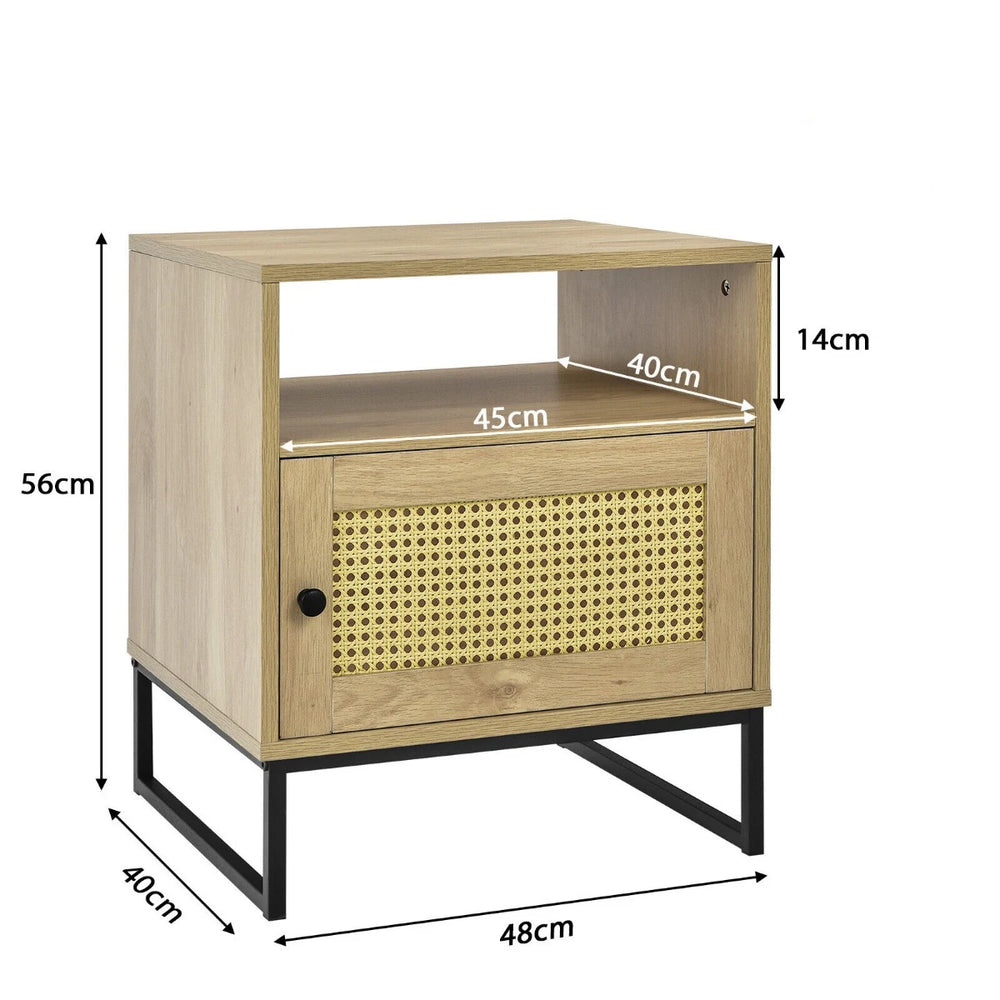 Wooden Side End Table with Cabinet and Rattan Decorated Door-Natural