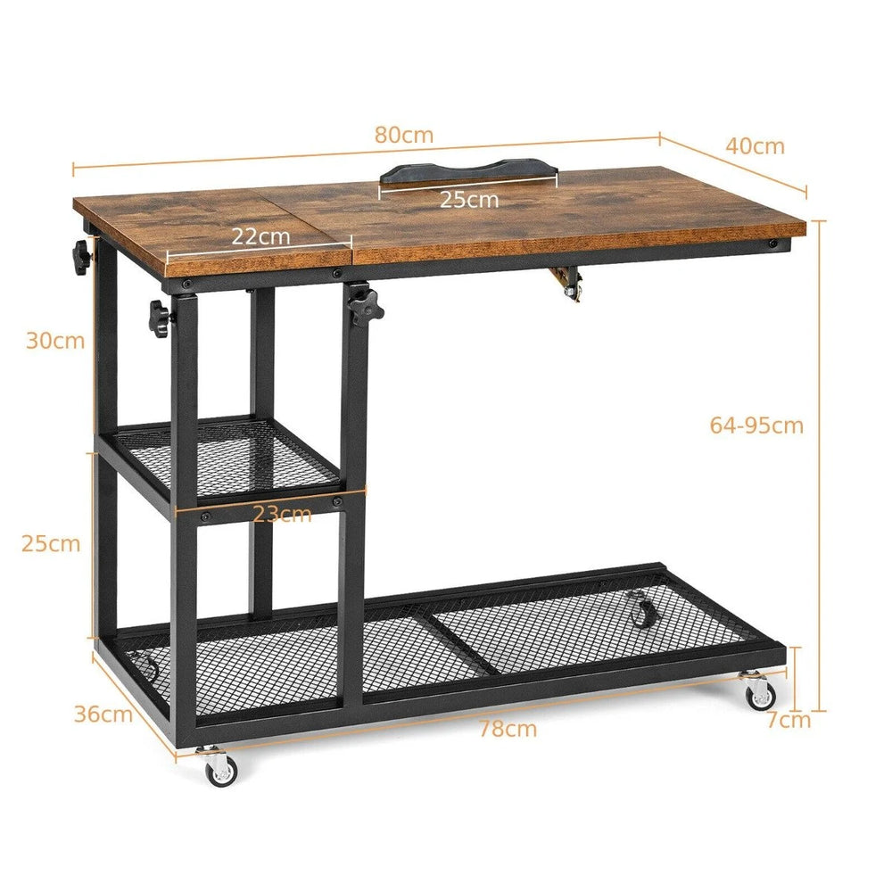 Two metal wire shelves under the desktop offer useful storage for books, remotes or snacks, each rated to carry around 10 kg (22 lbs). The whole unit is height adjustable between 63.5 cm and 95.3 cm to suit different bed and sofa heights and personal preferences.