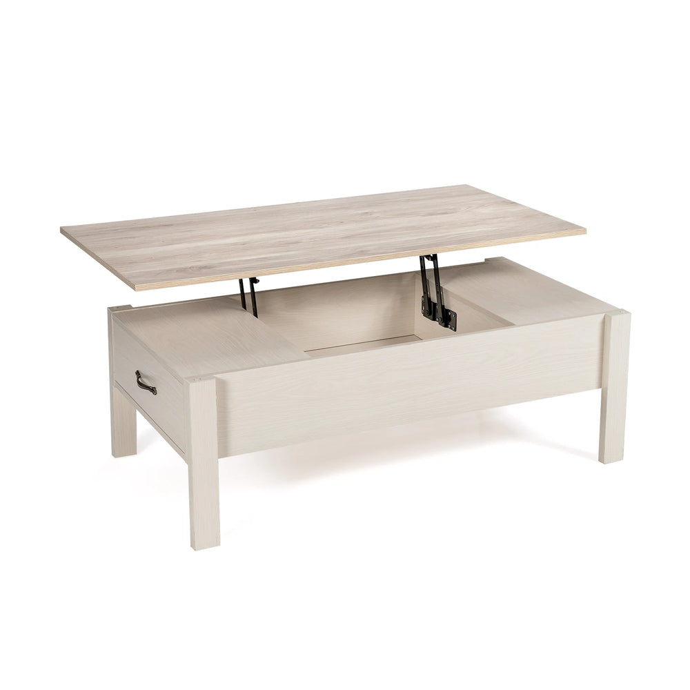 Color: Black/White Material: MDF, Engineered wood, metal Overall dimensions: 47" x 23.5" x 15.5" (L x W x H) Net weight: 57.5 lbs Maximum weight of tabletop: 200.5 lbs Maximum weight of lift table: 77 lbs Maximum weight of drawer: 11 lbs Maximum weight of storage cabinet: 22 lbs Package includes: 1 x Lift top coffee table 1 x User's manual