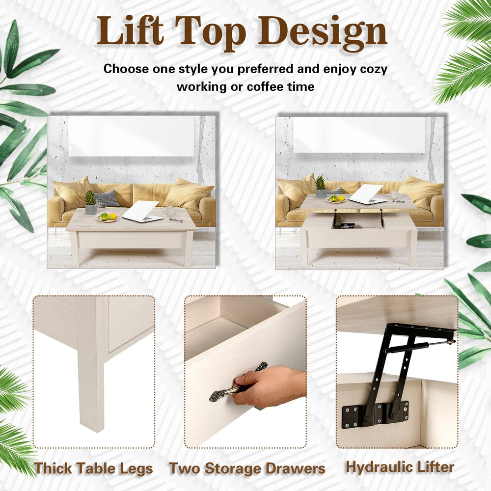 47 Inch Lift Top Coffee Table with Hidden Compartment and Drawers-White
