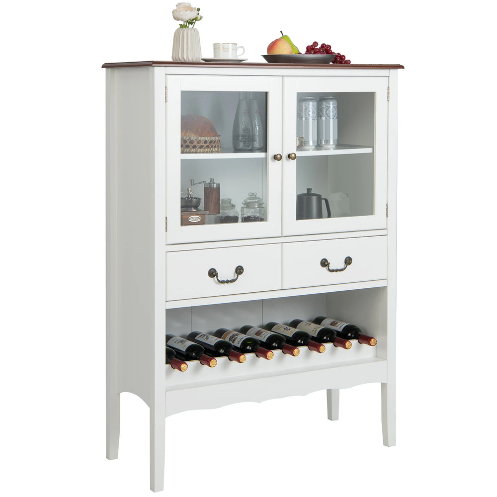This freestanding wine cabinet combines display and storage in a tidy, compact design. A spacious countertop and two tempered glass doors keep contents visible yet protected from dust, while an open rack and adjustable shelving let you arrange bottles, glassware and tableware for easy access.