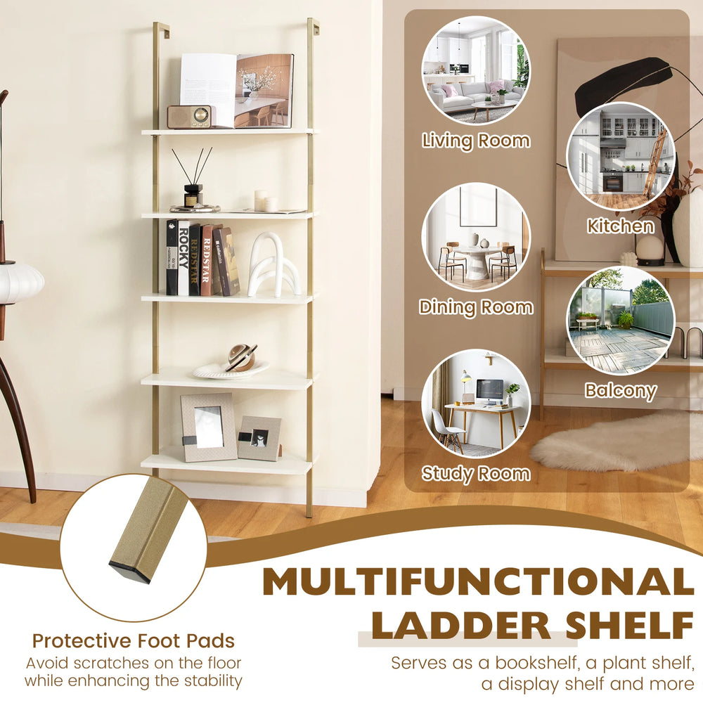Our 5-tier modern ladder bookcase can add warmth and character to any living space. With its elegant simple beauty, and solid and stable design, no matter where you are, you will fall in love with this bookcase. Designed with 5 tier ladder design, this wall-mount ladder bookshelf provides a spacious storage room and saves floor space to be used in the bedroom, living room, office or corridor, etc. Crafted from premium particleboard and a robust steel frame, this ladder shelf can support up to 30 kg on each layer, giving you durable and solid support for your beloved items. Simple, elegant, and stylish appearance well matches your home style! Bullet Points: 5-Tier Shelves for Display: The wall-mounted bookcase is designed with 5 open shelves that provide large storage spaces to keep your daily essentials and display decorations in order. Each shelf measures 11.8" in the gap, which ensures you put tall stuff on and offers more options for display combinations. Wall-Mounted Ladder Design: Featuring modern wall-mounted design, the slim ladder shape can fit perfectly into the small, awkward place in your room to make full use of your vertical space. Such industrial book shelves can save many home space and tidy your room. Meanwhile, the fully open shelves give you the easiest access to your stuff. Premium Material & Sturdy Construction: Crafted from the high-strength golden painted steel frame, our modern bookshelf is durable enough for long-time serving time. Besides, the bookcases of each layer are made of high-quality board and support a load-bearing capacity of up to 66 lbs(each shelf). The bottom non-slip adhesive pads can provide protection without damaging the floor. Easy to Assemble & Clean: The stand bookshelf comes with detailed and illustrated instruction in the package. You can quickly install the standing shelf under the guidance of clear instructions. What's more, the board surface is smooth and waterproof, so you can easily clean it with a cloth. Elegant Beauty for Decoration: The combination of the simple whiteboard with gold metal frame adds stunning charm to this ladder shelf. It is the best choice for your home decor to store or display your much-loved items in the order, matching better with your other furnishings and making your room more welcoming and inviting aesthetic. Features: 5 tier ladder shelf provides spacious storage space Premium wooden board can hold 30 kg for each panel Constructed of golden baking painted steel frame, rust-proof for durability Reinforced steel structure to support up to a total 150 kg weight capacity Full open shelves with proper height gap for easy fetching Elevated bottom to keep items away from dust and dirt on the floor Non-slip adhesive pads prevent scratching the floor Perfect for bathroom, kitchen, living room, bedroom, etc. Easy to clean and maintain with waterproof and smooth surface Easy to assemble in a short time with included manual and hardware Elegant and stylish appearance can better match your home decoration Specifications: Colour: White, Gold Material: Steel, Engineered Wood Overall dimension: 60 cm x 30 cm x 180 cm(L x W x H) Load capacity of each shelf: 30 kg Net weight: 12.5 kg Package Includes: 1 x 5-Tier Ladder Shelf 1 x User Guide