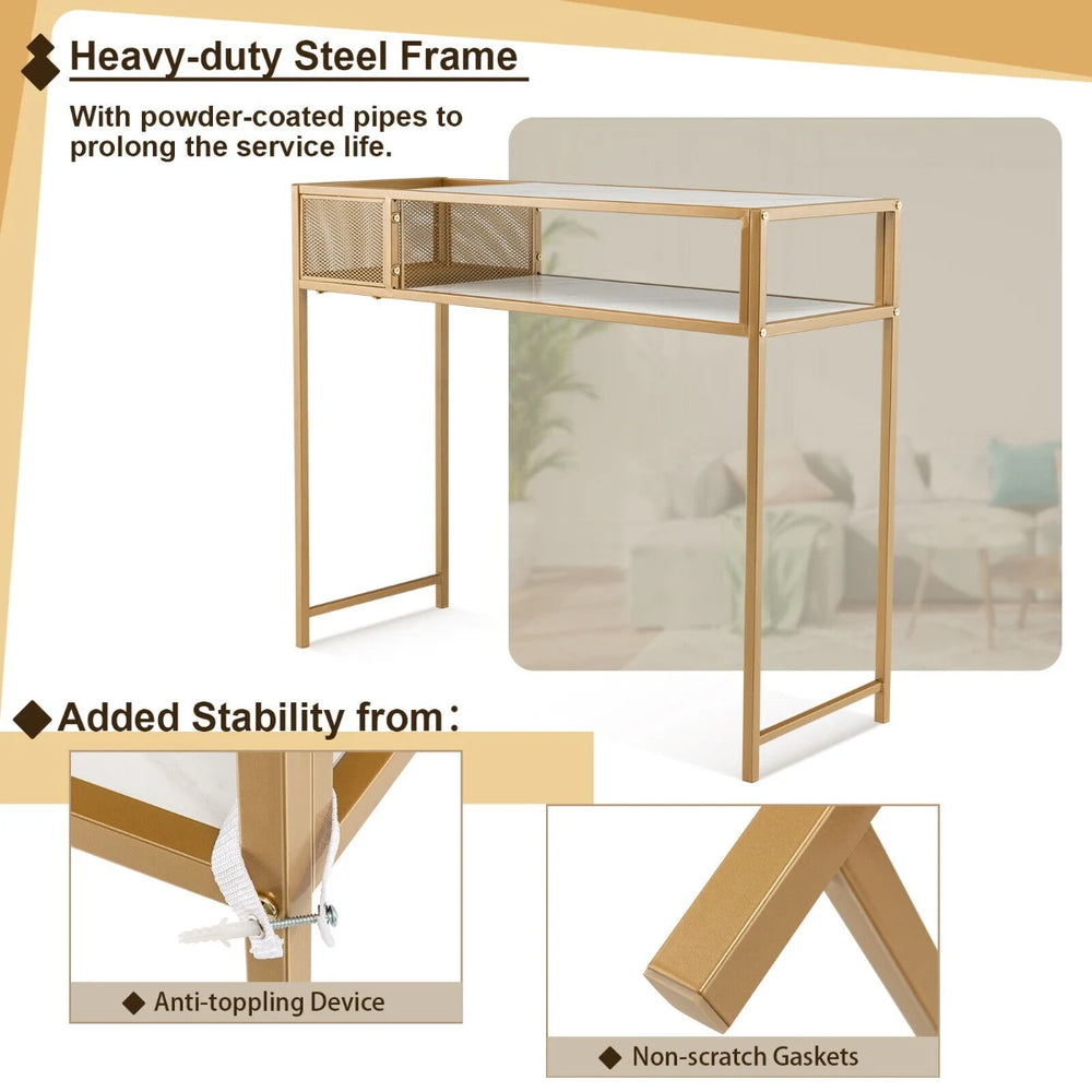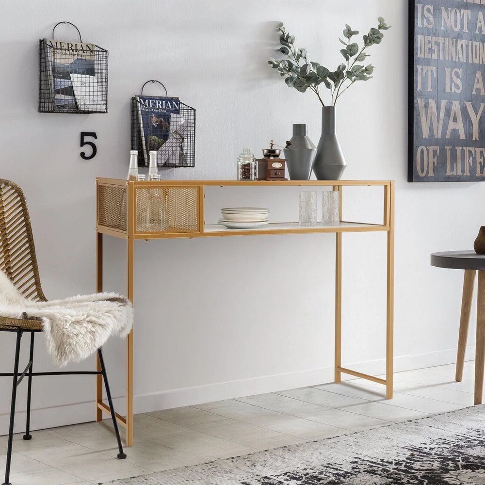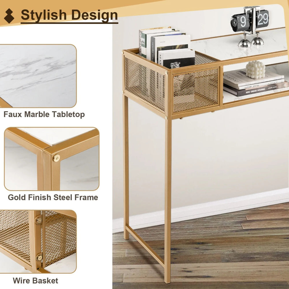 Have you found a practical yet stylish console table? This chic entryway table would be one of your ideal choice. The sleek lines, faux marble tabletop as well as gold steel frame add a sense of charm to your home and show your great taste, making this sofa table a stunning addition for various places. In addition, wide tabletop, open shelf and storage basket can well suit your different needs, which is a great storage solution for optimizing space and also makes your room more tidy and clean. The combination of MDF tabletop and heavy-duty steel frame brings long-lasting reliable service to you. Meanwhile, the hallway table is equipped with anti-toppling device for higher stability. All in all, the console table is a charming complement for any place, such as living room, bedroom, entryway, etc. Bullet Point: Exquisite Faux Marble Embellishment: The classic faux marble tabletop and gold steel frame create a charming decoration and add refined sensation to your home. Meanwhile, this stylish console table perfectly matches with other furniture and applies to any corner of your home, such as living room and hallway. 2-tier Design to Enlarge Storage: The wide tabletop allows you to store decorative items and daily supplies with great convenience. In addition, the mesh basket and open compartment provide additional storage and classified space for a variety of items, making it an ideal storage solution for your home. Rugged & Stable Construction: Delicately made of thick MDF and powder-coated steel frame, the entryway table shows perfect performance in lasting durability and great load bearing capacity. Other than that, equipped with anti-toppling device, the sofa table can be attached to the wall to prevent wobbling. Perfect Addition for Home: In addition to being used as a console table, it can be served as a couch table, entryway table, or foyer table, etc. In addition, the sofa table combines functionality and versatility into one, making it an eye-catching furniture for living room, hallway, bedroom and so on. Make Assembly in a Breeze: All parts and components are tightly wrapped. The entryway table comes with an illustrated manual and necessary hardware to make assembly effortlessly. Besides, the smooth surface is easy to clean and maintain, which helps you reduce cleaning burdens. Features: Unique faux marble tabletop and gold steel tubes highlight your home Wide tabletop provides enough space to hold frequent-used items Storage basket and open compartment keep items classified and organized Power-coated steel frame accounts for reliable structure Non-slip foot pads prevent the floor from getting damaged Chic and stylish design fits well with interior decoration Used as a console table, entryway table, and sofa table, etc Perfect collocation for living room, bedroom, entryway, etc Easy to assemble according to the detailed instruction Specifications: Colour: White+Gold Material: MDF, Steel Overall Dimension: 110cm x 40cm x 90.5cm(L x W x H) Dimension of Open Shelf: 82cm x 40cm x 16.5cm(L x W x H) Dimension of Mesh Basket: 26cm x 36cm x 18.5cm(L x W x H) Net Weight: 12.5kg Weight Capacity of Tabletop: 20kg Weight Capacity of Open Shelf: 20kg Weight Capacity of Mesh Basket: 10kg Package Includes: 1 x Console Table 1 x User Guide