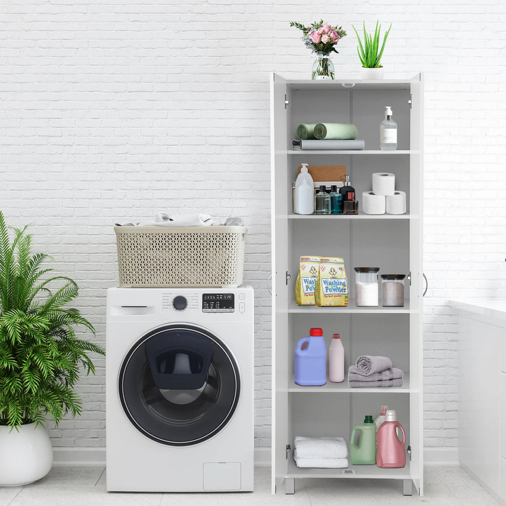 Color: White Overall dimension: 23.5"L x 15.5"W x 75"H Material: Engineered wood, MDF Loading capacity: 50 Ibs per shelf Net weight: 96 Ibs Package includes: 1 x Double-door standing tall storage cabinet 1 x Instruction