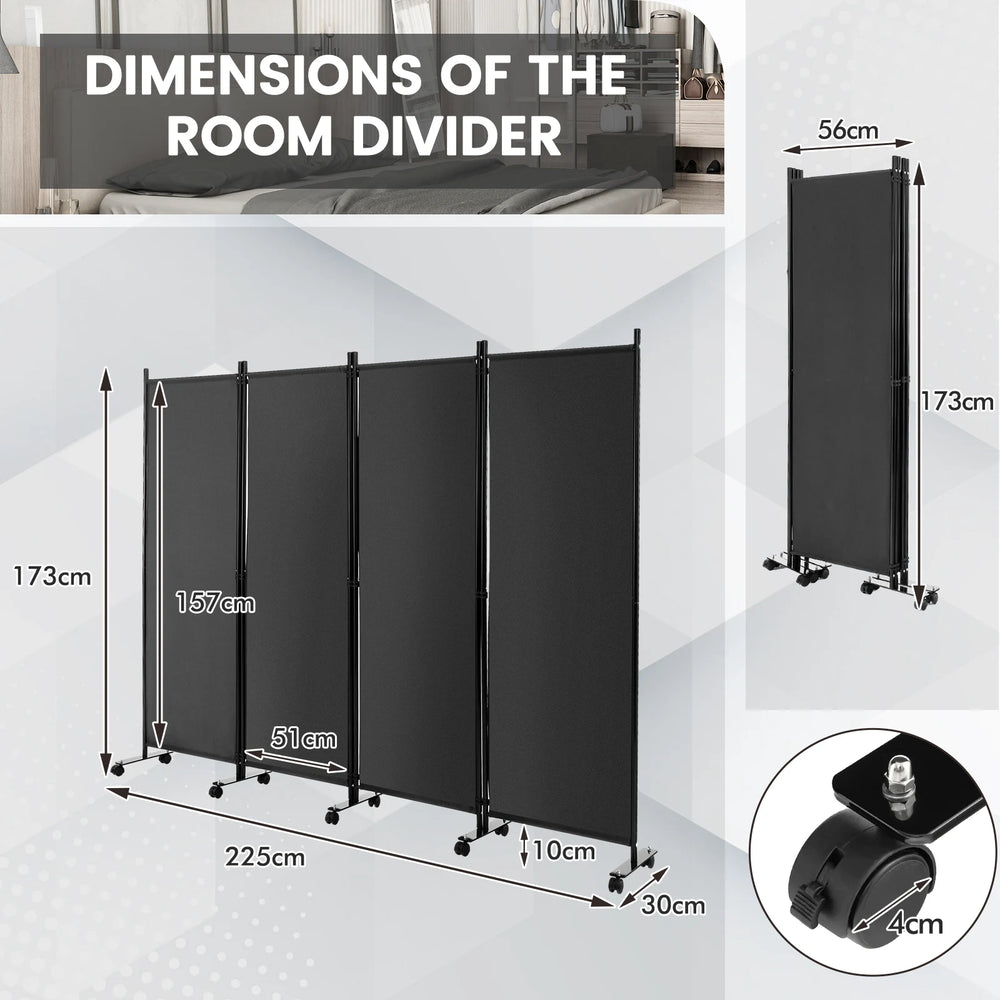 4-Panel Folding Room Divider 6 Feet Rolling Privacy Screen with Lockable Wheels-Gray