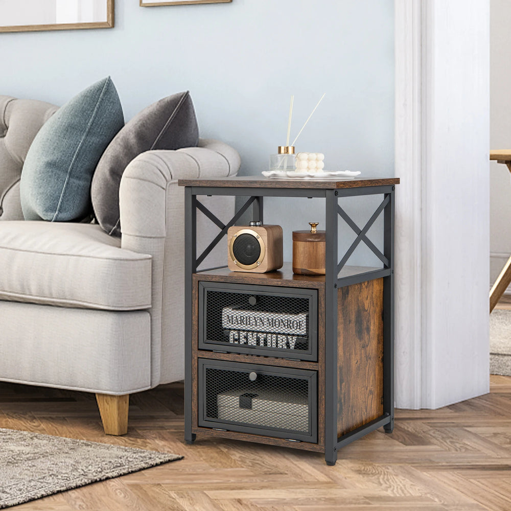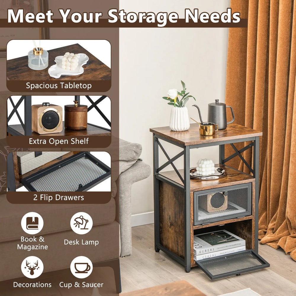 Set of 2 Modern Nightstand with 2 Flip Drawers and Open Shelf-Rustic Brown