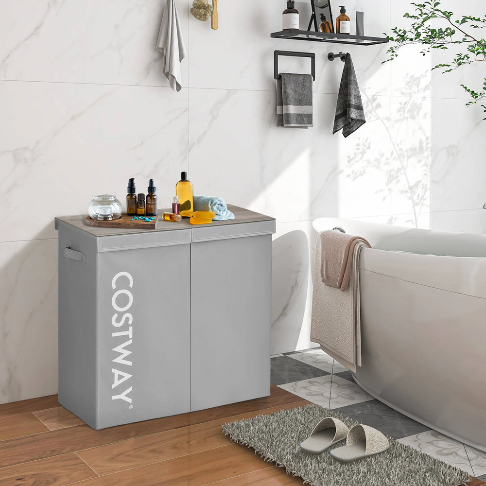 105L Laundry Hamper with Wooden Lid and 2 Sections-Grey