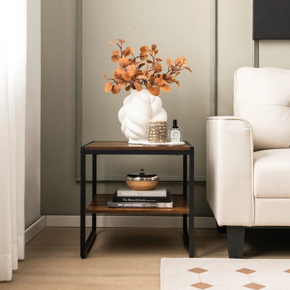 The 2 pcs end table set is a good choice for the bedroom, living room or hallway, bringing plenty of space for storage & display. What's more, with heavy-duty construction, the spacious tabletop of the side table is strong enough to support 50 kg, able to hold a mini fridge, a printer, a plant pot, etc. Moreover, there are adjustable foot pads fitted at the base, which are practical to level the table for better balance and protect the floor from scratches. In addition, the square end tables are widely applicable to rooms big or small, and they can be arranged freely for different purposes. Bullet Point: Spacious 2-Tier Storage Capacity: The industrial end table features a 50" square tabletop and an open storage shelf, offering ample space for storage and display. The spacious tabletop is suitable for holding lamps, cups and photos, while the lower shelf adds to the storage space for baskets, magazines and plants. Metal Frame with Superior Stability: Supported by a heavy-duty metal frame, the accent table boasts a reliable construction and large weight capacity, of which the tabletop can support up to 50 kg. Meanwhile, the rustproof material also prolongs the service time, and the adjustable foot pads prevent it from wobbling. 2 PCS Multifunctional End Tables: Thanks to the functional storage space and sturdy construction, the sofa table set is a versatile addition that you can explore the endless possibilities of usage. It is not only an end table but also a mini fridge stand, a printer stand, a turntable stand, etc. Free Combination: The 2pcs square side tables can be freely combined for different purposes. For example, they can be used together to make up a long rectangular coffee table. Together with the beautiful rustic brown boards with natural wood grain, the multifunctional set can blend into different decorations. Easy Assembly & Maintenance: With illustrated instructions and complete accessories, it is a breeze for you to put the cocktail table together. What's more, there is enough clearance from the floor, which is convenient for a vacuum robot to go through and do the cleaning. The smooth surface is also waterproof and easy to clean. Features: The 2-tier design offers open storage space for living room essentials The spacious tabletop can accommodate a mini fridge or a printer Industrial end table set suitable for bedroom and living room Sturdy and rustproof metal frame for a large weight capacity Adjustable foot pads help the table adapt to uneven floor 2 pcs set enables you to use them together or use separately Vacuum robot-friendly clearance for easy cleaning Specifications: Colour: Rustic Brown Material: Engineered Wood, Metal Overall Dimensions: 50 x 50 x 50 cm (L x W x H) Clearance Between 2 Shelves: 24.5 cm Shelf Height from Floor: 20 cm Max Weight Limit of Tabletop: 50 kg Max Weight Limit of Shelf: 35 kg Net Weight: 15 kg Package Includes: 2 x End Tables 1 x Instruction