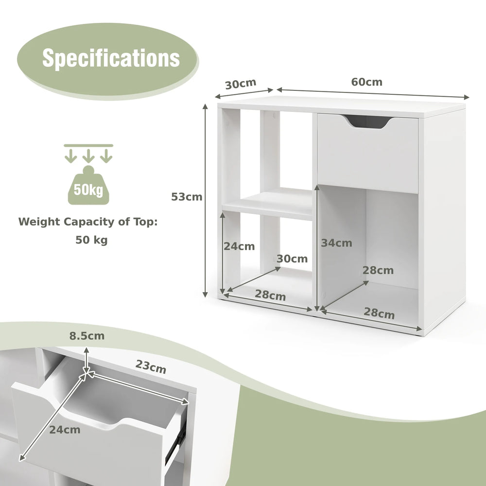 Color: White Material: Engineered Wood, MDF Overall Dimension: 60 x 30 x 53 cm (L x W x H) (Internal) Dimension of the Drawer: 23 x 24 x 8.5 cm (L x W x H) Net Weight: 11 kg Weight Capacity of Top: 50 kg Weight Capacity of Each Shelf: 10 kg Weight Capacity of Drawer: 5 kg Package includes: 1 x Storage Shelf 1 x Instruction