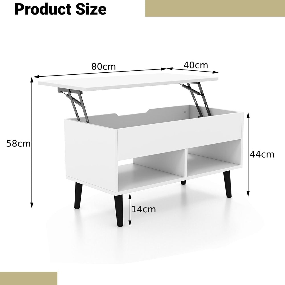 Colour: White Material: Engineered Wood, MDF, Solid Wood Overall Dimension: 80 x 40 x 44cm (L x W x H) Overall Dimension(Lifting): 80 x 40 x 58 cm (L x W x H) Clearance from Shelf to Ground: 14 cm Net Weight: 14.5 kg Weight Capacity of Tabletop: 10 kg Weight Capacity of Hidden Compartment: 30 kg Weight Capacity of Each Shelf: 10 kg Package Includes: 1 x Lift Top Coffee Table 1 x Instruction Manual