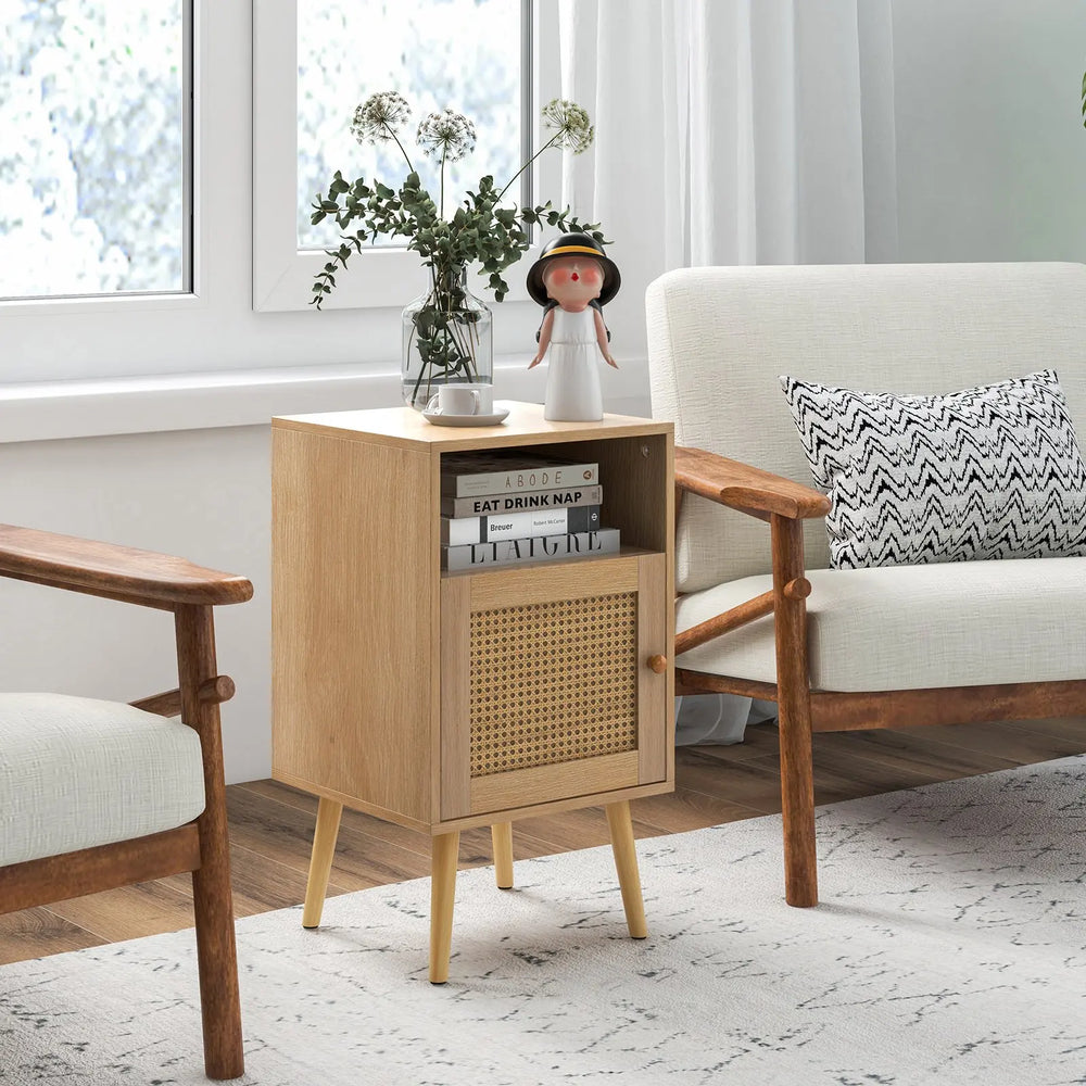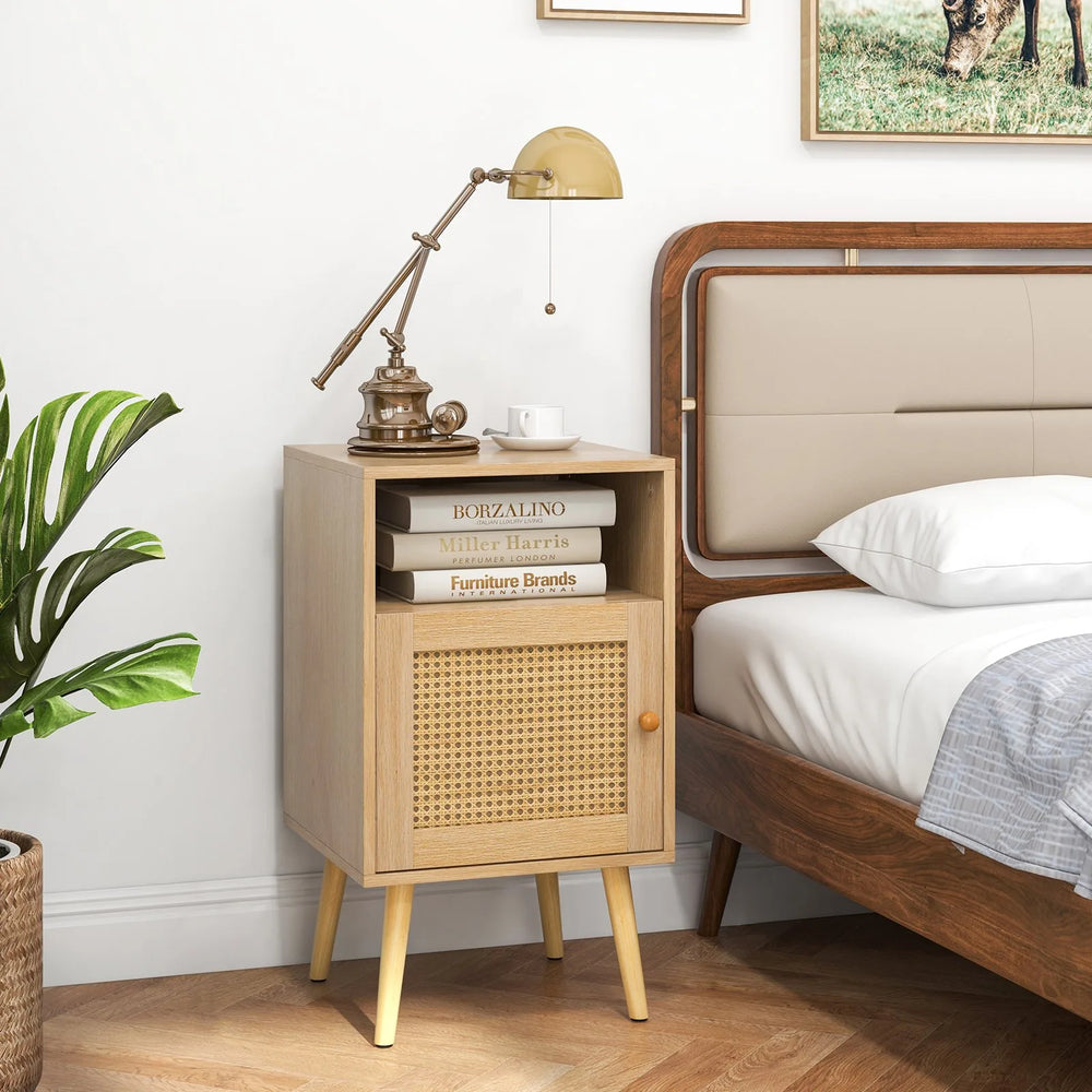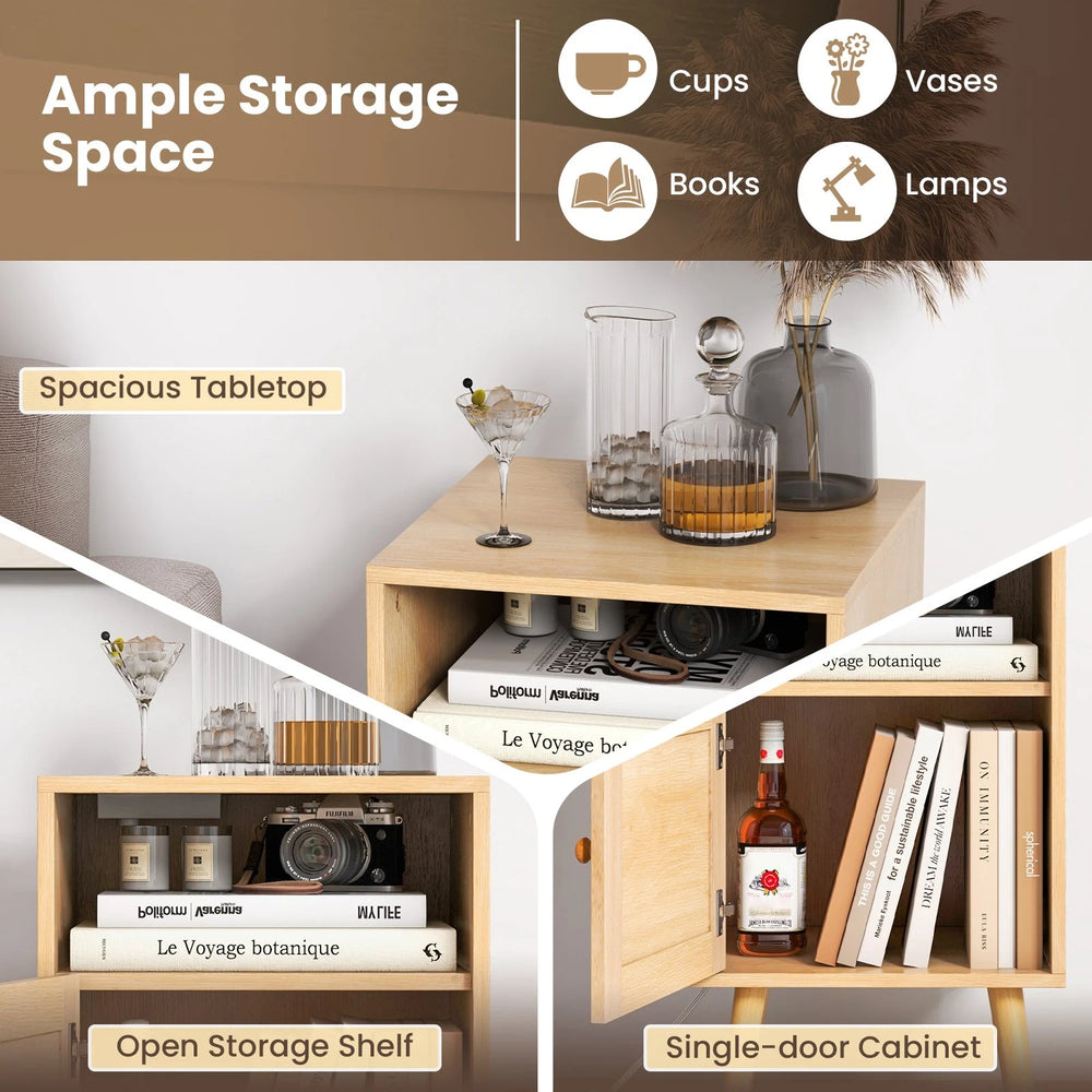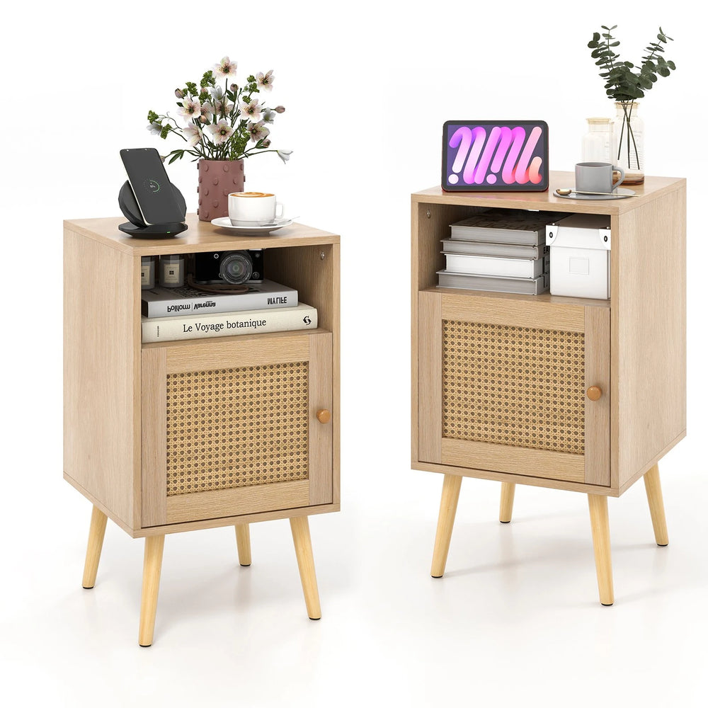Rattan Nightstand with Storage and PE Rattan Decorated Door-Natural-2 Pack