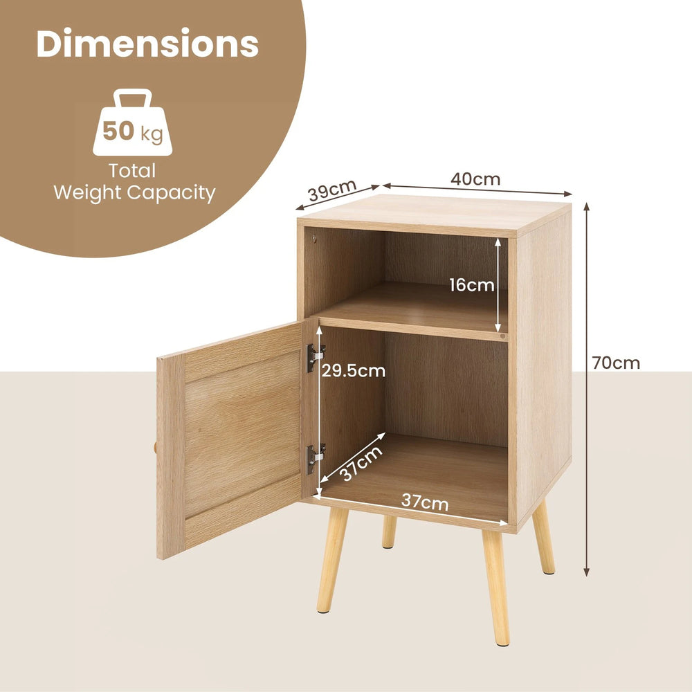 Colour: Natural Material: Engineered Wood, Pine, PE Rattan, MDF Product Dimension: 40 cm x 39 cm x 70 cm(L x W x H) Cabinet Size: 37 cm x 37 cm x 29.5 cm(L x W x H) Open Compartment Size: 37 cm x 37 cm x 16 cm(L x W x H) Tabletop Maximum Weight: 20kg Shelf Maximum Weight: 15kg Total Weight Capacity: 50 kg Net Weight: 11kg