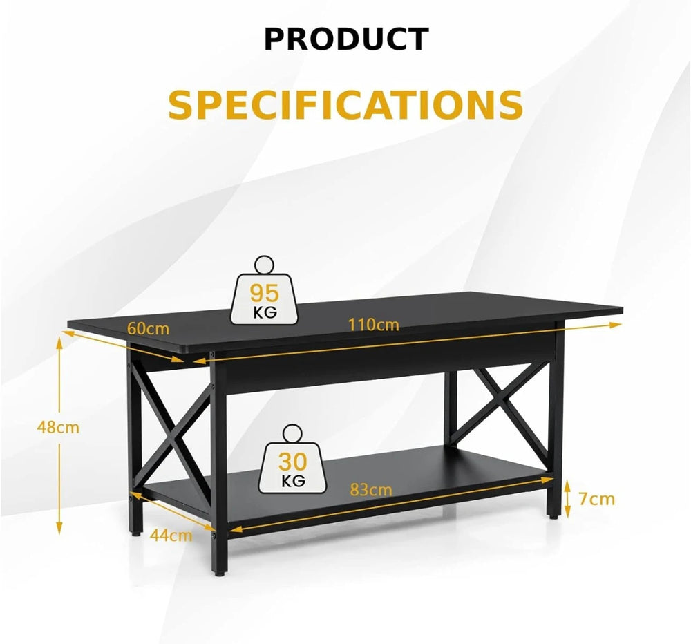 Colour: Rustic Brown/Black Material: Engineered Wood, Steel Overall Dimensions: 110 x 60 x 48 cm (L x W x H) Weight Capacity of Tabletop: 95 kg Weight Capacity of Shelf: 30 kg Net Weight: 16 kg Package Includes: 1 x Coffee Table 1 x Instruction Manual