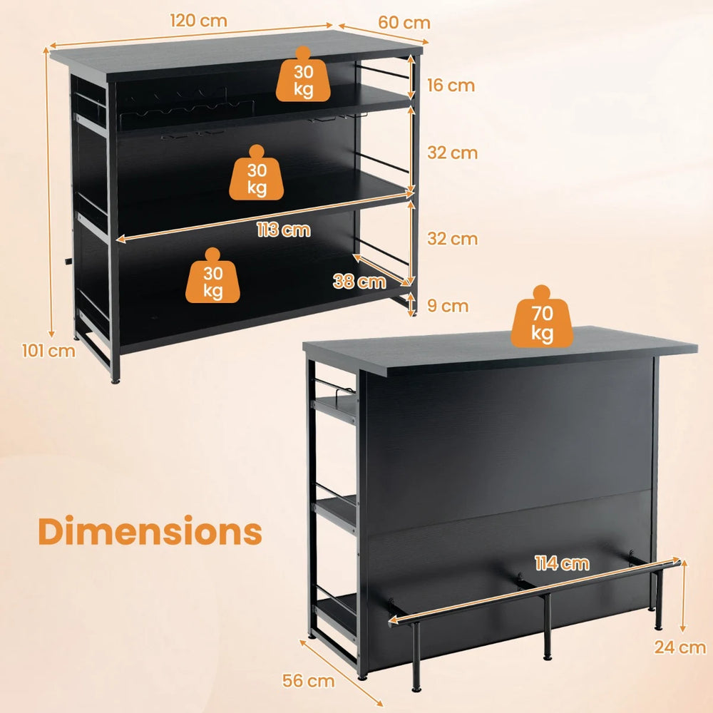 Colour: Rustic Brown/Black Material: Metal, MDF Overall Dimensions: 120 x 60 x 101 cm (L x W x H) Shelf Size: 113 x 38 cm (L x W) Footrest Length: 114 cm Footrest Height: 24 cm Weight Capacity of Tabletop: 70 kg Weight Capacity of Each Shelf: 30 kg Weight Capacity of Footrest: 45 kg Net Weight: 38 kg Note: Stools are NOT included. Package Includes: 1 x Home Bar Unit 1 x Instruction Manual