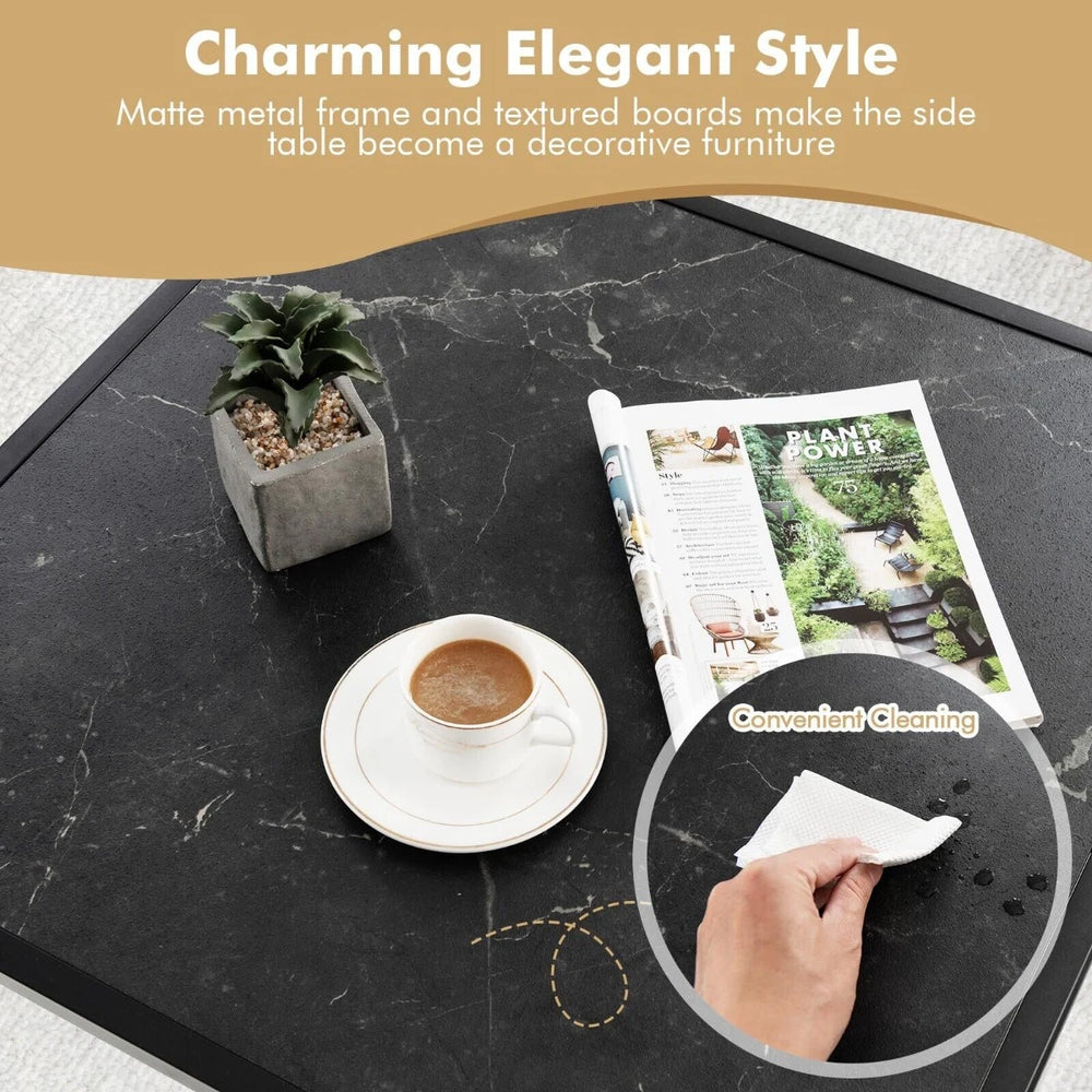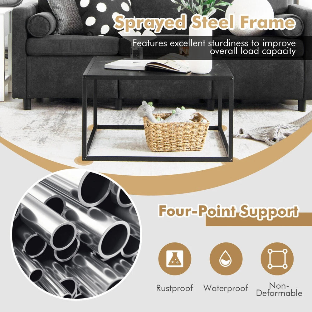 Composed of a faux marble tabletop and a matte steel frame, this coffee table looks very delicate and is a charming decoration for your home. Furthermore, the sturdy steel frame also enhances overall load capacity up to 45kg and its sprayed surface achieves better rustproof performance. At the bottom, the coffee table is fitted with four anti-slip pads, getting rid of unwanted wobbling. Except for a wide tabletop, the coffee table provides you with extra bottom clearance for sundries, such as books, shoes, magazines and more. You can place it in the living room, study or bedroom. The whole assembly is a piece of cake and wont cost much time.If you are looking for a product like this, do not hesitate to place an order! Elegant Faux Marble Design: Designed with a sleek square shape and pure colours, the coffee table looks minimalist. Plus, the tea table also features a faux marble tabletop and a matte iron frame. Both bring out a charming minimalist style, giving your home a new elegant look. Sturdy Sprayed Metal Frame: There are four bottom crossbars contacted with the ground, distributing overall pressure evenly to avoid unwanted wobbling. Besides, the whole structure is made of iron which offers excellent sturdiness as well as perfect rustproof performance. Roomy Storage Areas: Coming with a wide tabletop, this centre table accommodates plenty of sundries, such as a laptop, magazines, drinks and so on. More, the snack table is also designed with a roomy bottom clearance where you can freely stretch your legs or store more boxes, books, shoes and more. Thoughtful Anti-Slip Pads: This accent cocktail table is fitted with four anti-slip pads to further enhance overall stability. Meanwhile, these pads also prevent many accidental floor scratches, enabling you to place the coffee table in various rooms without any concerns. Hassle-Free Installation: Without complicated steps or professional tools, the simple assembly is very nice for people who lack of installation experience. Only costing a short time, you will get an elegant sofa side table. And the smooth surface can save you the time of daily maintenance.