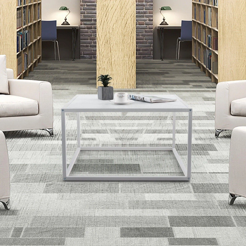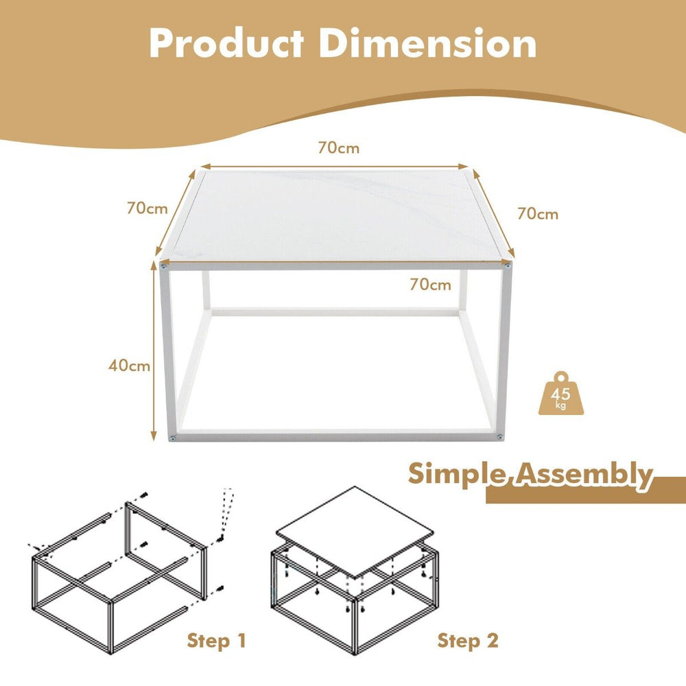 This square coffee table pairs a faux marble tabletop with a matte coated steel frame for a refined, minimalist look. The clean white finish and compact 70 x 70 footprint suit modern living rooms, studies or bedrooms while adding a touch of elegance to your space.