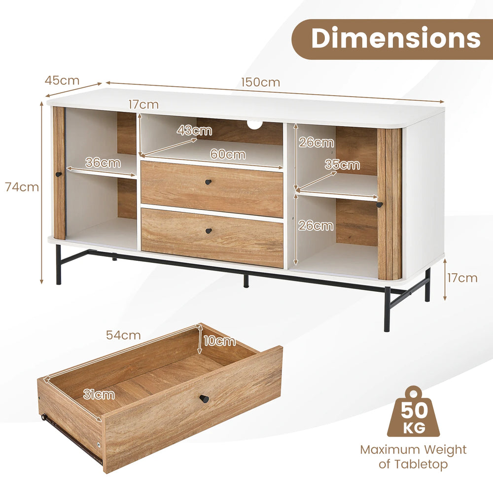 Colour: White Material: Engineered Wood, MDF, Metal Overall Dimensions: 150 x 45 x 74 cm (L x W x H) Interior of Drawer: 54 x 31 x 10 cm (L x W x H) Clearance Between Ground and Cabinet: 17 cm Maximum Weight Capacity of Tabletop: 50 kg Net Weight: 46 kg Package Includes: 1 x Buffet Cabinet 1 x Instruction Manual