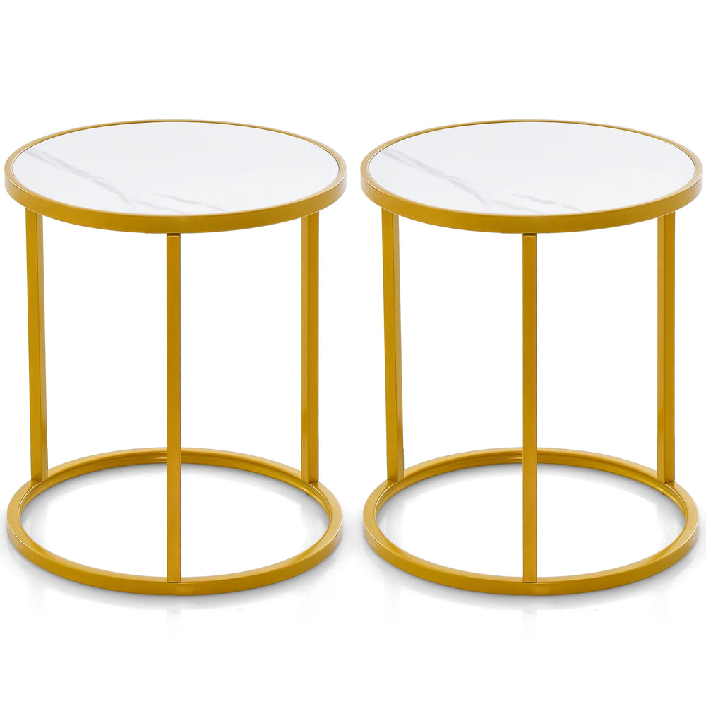 16 Ince Marble Top Round Side Table with Golden Metal Frame for Living Room Bedroom-Set of 2
