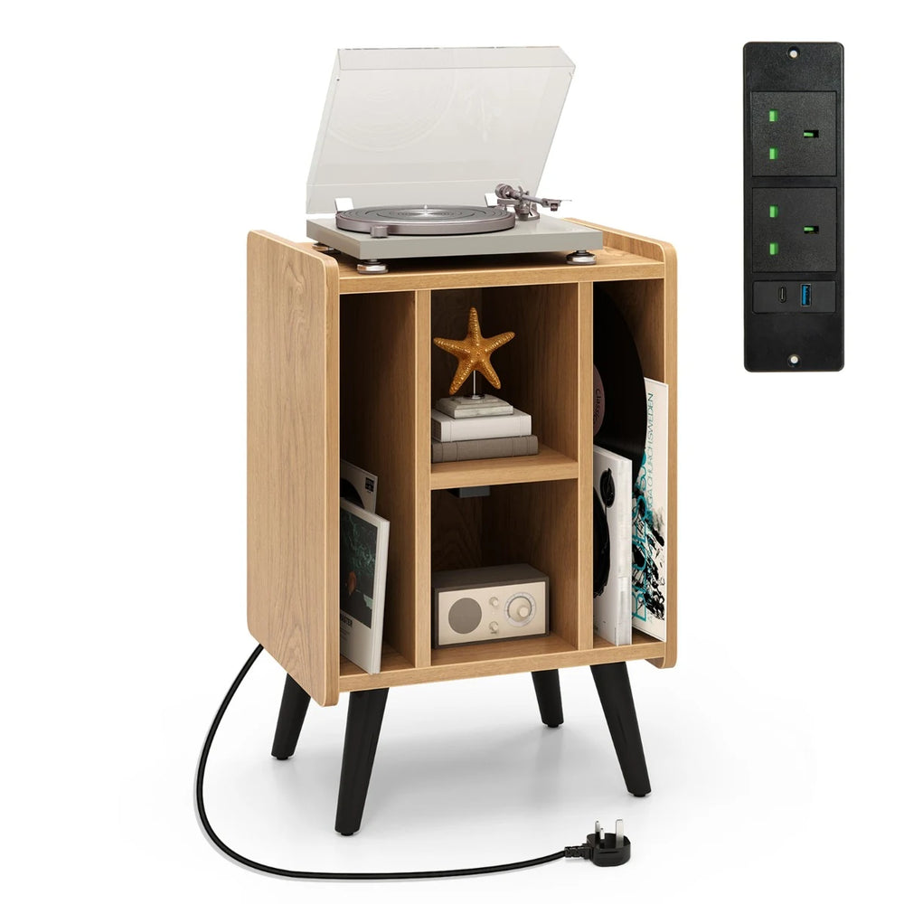 This record player stand takes up a small space while providing you with ample space to store a record player, albums, records, speakers, headsets or ornaments. The multi-sized opening shelves meet all of your different storage needs and make the items available at your fingertips. Besides, it is built with 2 power outlets, 1 USB and 1 Type-c charging port for you to flexibly charge a record player, turntable, receiver, speaker, phone, headset or tablet. The circular wire hole on the back panel makes it easy for you to connect music devices. It also comes with more thoughtful details such as wood grain surface and sturdy supporting legs, ensuring good using experience. Moreover, this record player stand adopts a modern design with an elegant appearance, which can match well with all your room decorations. Hence, it not only can be used as a turntable stand but also serve as a bookcase, bedside table, file cabinet, etc. If you are looking for a record player stand like this, do not hesitate to place an order! Small Footprint and Ample Storage Space: This record player stand takes up a small space with a compact size: 43 x 34 x 67cm(L x W x H), greatly saving your room space. It comes with a wide countertop for you to display a record player, 2 vertical spaces for albums, records, CDs and magazines, while 2 middle shelves organizing your speakers, headsets or ornaments. Built-in Charging Station: Featuring 2 power outlets, 1 USB and 1 Type-c charging ports, this record player stand allows you to flexibly charge a record player, turntable, phone, headset or tablet. Meanwhile, the circular wire holes on the back panel and the top wire hole cover make it convenient for you to connect music devices. Multi-Occasions Use: This record player stand is designed with clean lines and wood grain surface, standing out for a two-tone color with a wood grain veneered frame and black supporting legs, matching well with different room styles. Hence, it also can serve as a bookcase, bedside table, file cabinet, etc. Sturdy Frame: Constructed from high quality engineered wood as well as sturdy supporting legs, this record player stand is anti-collapsing and not easy to deform, showing you long-lasting durability performance. Plus, the countertop comes with anti-falling baffle to prevent items from falling. Easy Assembly and Maintenance: Coming with a detailed and illustrated instruction as well as required accessories, the record player stand can be put together without taking too much time. When it comes to daily maintenance, you can just clean it with a soft rag.