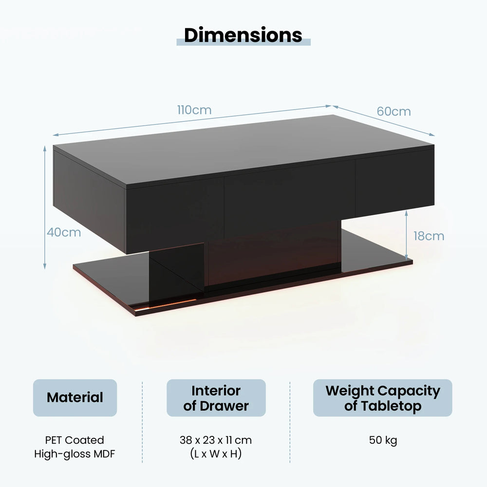 Color: White/Black Material: PET Coated High-gloss MDF Overall Dimensions: 43.5" x 23.5" x 16"/110 x 60 x 40 cm (L x W x H) Interior of Drawer: 15" x 9" x 4.5"/38 x 23 x 11 cm (L x W x H) Space Between Cabinet and Bottom Shelf:7"/18.5 cm Weight Capacity of Tabletop: 110 lbs/50 kg Weight Capacity of Drawer: 18 lbs/8 kg Weight Capacity of Bottom Shelf: 110 lbs/50 kg Net Weight: 71 lbs/32 kg Package Includes: 1 x Coffee Table with LED Light 1 x Remote Control 1 x Instruction