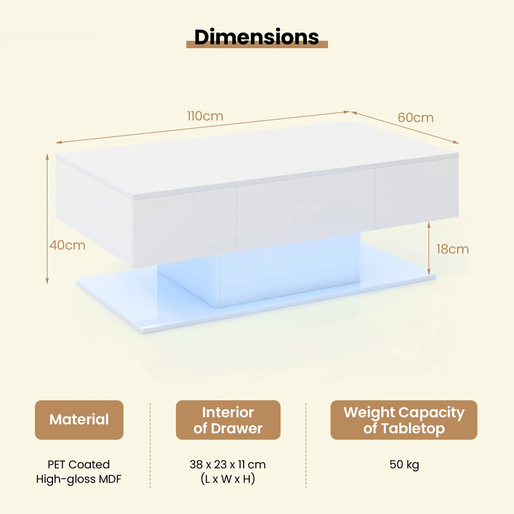 Color: White/Black Material: PET Coated High-gloss MDF Overall Dimensions: 43.5" x 23.5" x 16"/110 x 60 x 40 cm (L x W x H) Interior of Drawer: 15" x 9" x 4.5"/38 x 23 x 11 cm (L x W x H) Space Between Cabinet and Bottom Shelf:7"/18.5 cm Weight Capacity of Tabletop: 110 lbs/50 kg Weight Capacity of Drawer: 18 lbs/8 kg Weight Capacity of Bottom Shelf: 110 lbs/50 kg Net Weight: 71 lbs/32 kg Package Includes: 1 x Coffee Table with LED Light 1 x Remote Control 1 x Instruction