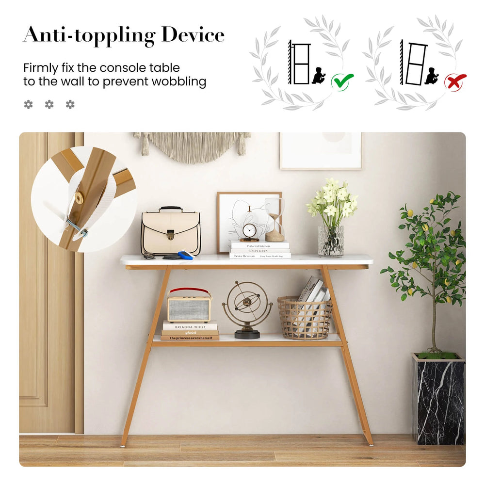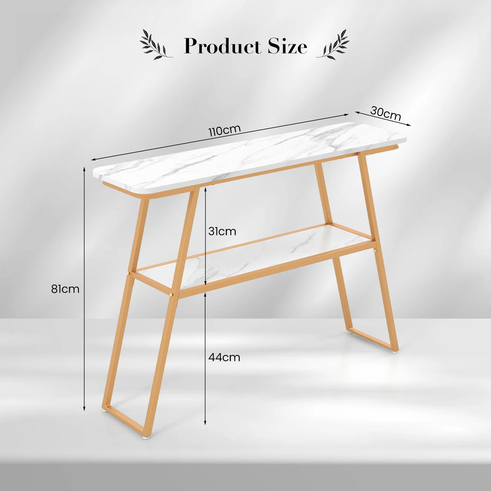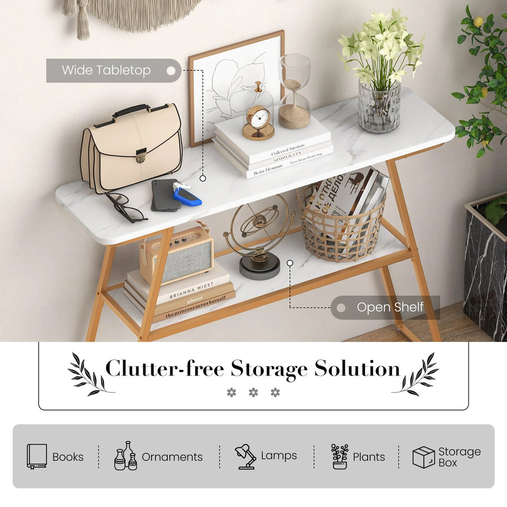 Console Table with Open Shelf Gold Metal Frame Living Room Hallway-White