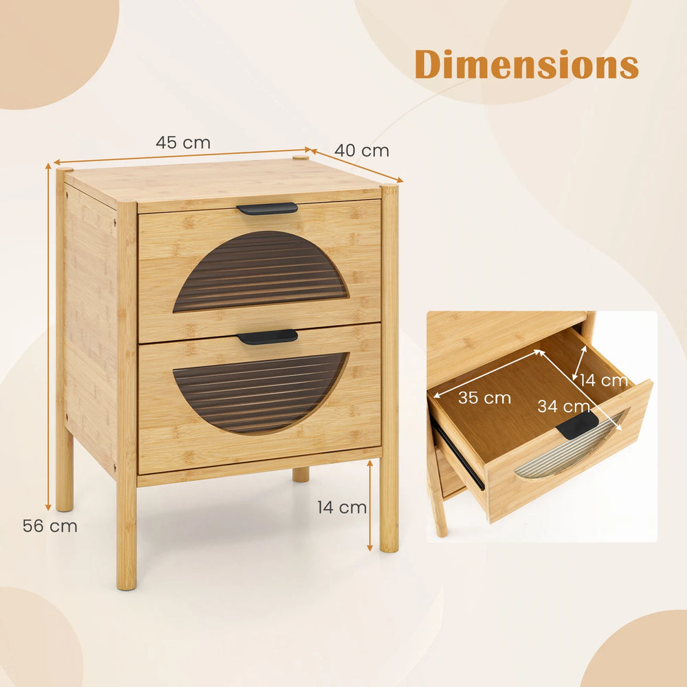 Bamboo Nightstand with 2 Storage Drawers and Reeded Tempered Glass Fronts-Natural
