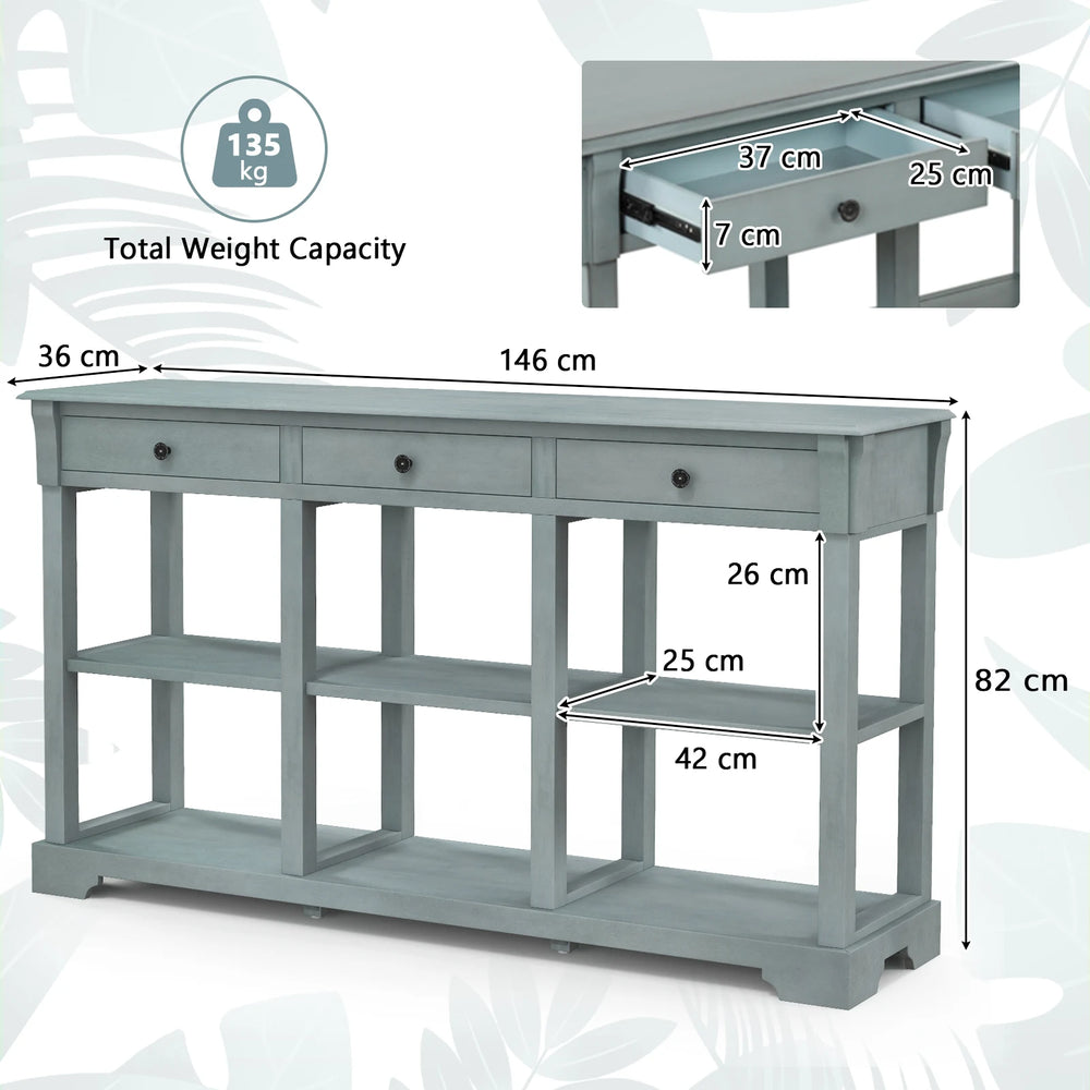58" Retro Console Table with 3 Drawers and Open Shelves Rectangular Entryway Table-Blue