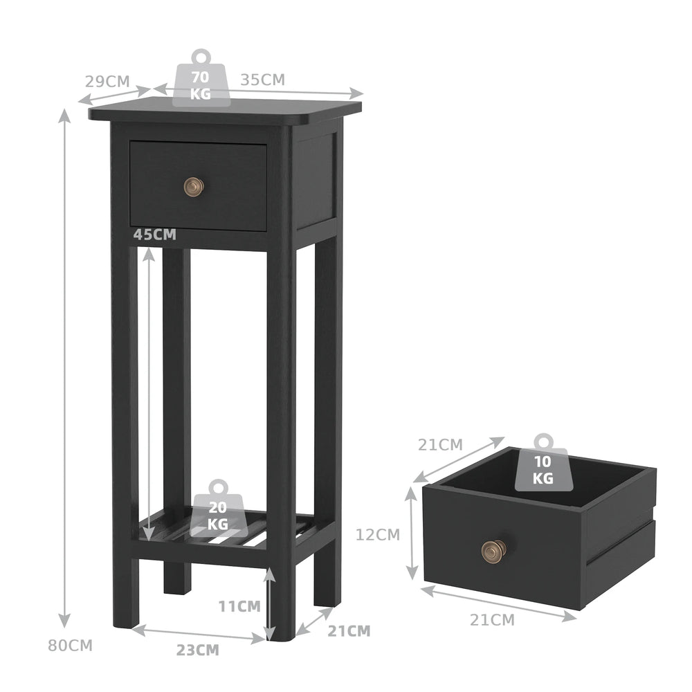 Color: Black/White/Grey Material: MDF, Acacia Wood Overall Dimension: 35 cm x 29 cm x 80 cm (L x W x H) Net Weight: 6.6 kg Weight Capacity of Tabletop: 70 kg Weight Capacity of Drawer: 10 kg Weight Capacity of Bottom Shelf: 20 kg Package includes: 1 x End Table