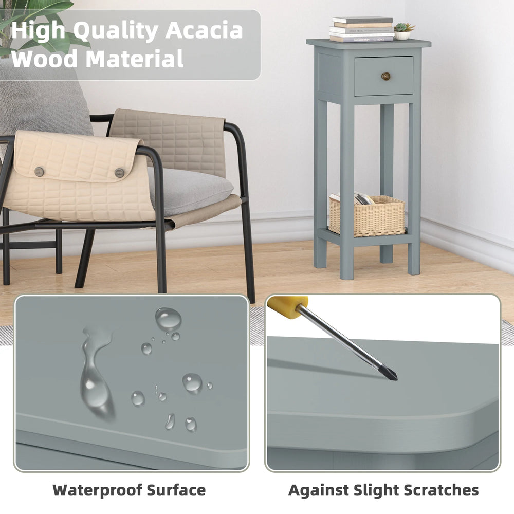 Color: Black/White/Grey Material: MDF, Acacia Wood Overall Dimension: 35 cm x 29 cm x 80 cm (L x W x H) Net Weight: 6.6 kg Weight Capacity of Tabletop: 70 kg Weight Capacity of Drawer: 10 kg Weight Capacity of Bottom Shelf: 20 kg Package includes: 1 x End Table