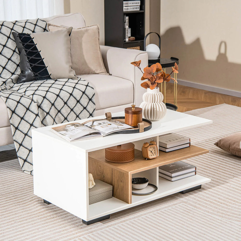 Coffee Table 3-Tier Rectangular Center with L-Shaped Middle Shelf-White