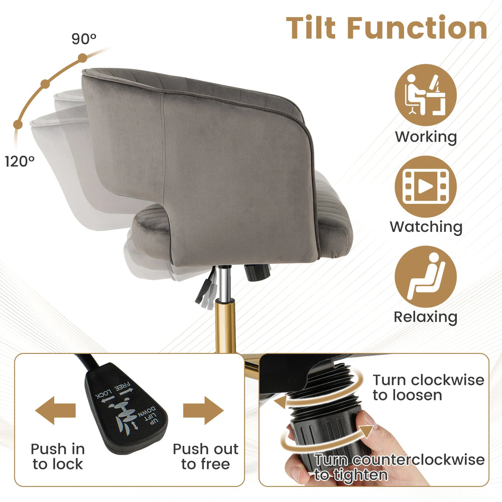 Sink into comfort with our swivel velvet desk chair! This velvet home office chair features a tufted back and seat filled with high-density sponge, providing a supportive and cozy experience for you. Additionally, the computer task chair offers a 360° swivel function, 90°-120° tilt option, and adjustable height to meet your different needs. Its 4 rolling wheels allow for effortless movement around your workspace. With a luxurious golden base, this chair is not only stylish but also sturdy, making it a versatile piece for your home. Whether you are getting ready in your bedroom, working in your study, or simply adding a touch of elegance to your living room, this modern swivel vanity chair is a perfect choice. Bullet Points: Designed for Comfort: Crafted with comfort in mind, this velvet home office chair is designed with a tufted back and seat, both filled with high-density sponge. Even during extended hours sitting at your desk, you can sit comfortably and feel supported. Adjustable Features: The 360° swivel desk chair allows you to freely turn in any direction, complete with a 90°-120° tilt function so that you can recline for ultimate relaxation. Moreover, the adjustable height is suitable for people of different heights. Easy to Move around: Designed for effortless movement, this modern swivel vanity chair is equipped with 4 rolling wheels, which ensure you can navigate around your workspace with ease. Modern and Stylish Design: The chair’s golden base adds a luxurious touch and resilient build quality, making it a centerpiece in your home for years to come. No matter where it presents, this modern desk chair introduces a touch of elegance. Multipurpose Desk Chair: Whether you’re dressing up in your bedroom, conquering the workday in your study, or seeking a chic addition to your living room, this swivel velvet desk chair has you covered. Description: Sink into comfort with our swivel velvet desk chair! This velvet home office chair features a tufted back and seat filled with high-density sponge, providing a supportive and cozy experience for you. Additionally, the computer task chair offers a 360° swivel function, 90°-120° tilt option, and adjustable height to meet your different needs. Its 4 rolling wheels allow for effortless movement around your workspace. With a luxurious golden base, this chair is not only stylish but also sturdy, making it a versatile piece for your home. Whether you are getting ready in your bedroom, working in your study, or simply adding a touch of elegance to your living room, this modern swivel vanity chair is a perfect choice.