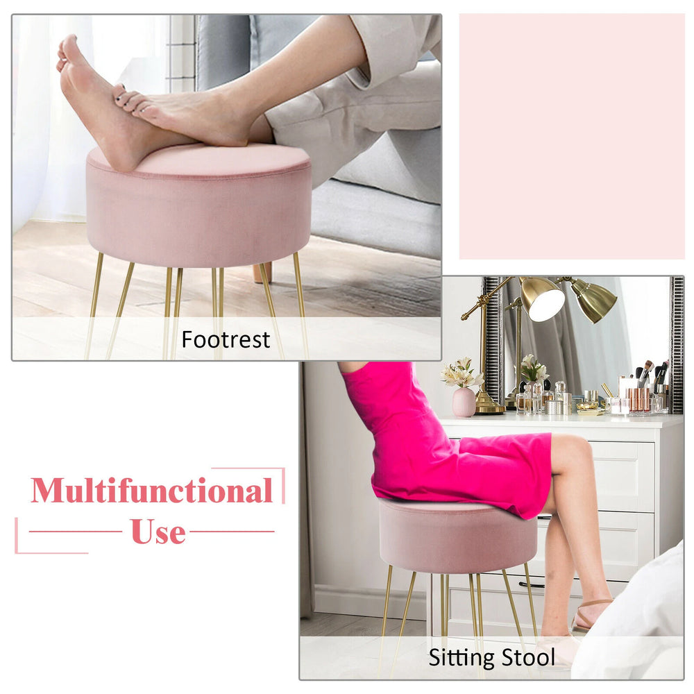 This pink velvet round footstool blends a modern look with practical function. The seat is upholstered in soft, skin-friendly velvet over a premium sponge cushion for comfortable resting, while an engineered MDF shell and reinforced steel support give the stool stable, long-lasting performance.