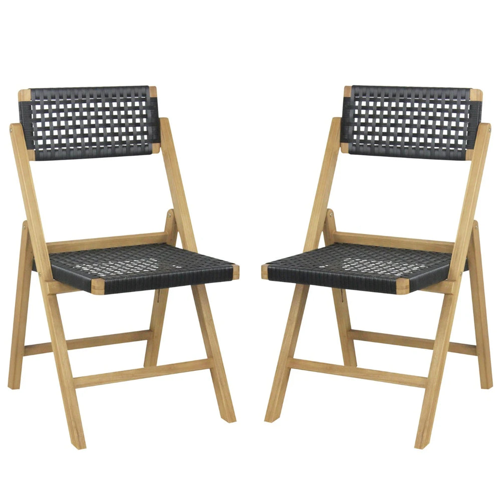 Set of 2 Folding Chairs Teak Wood Dining Chairs with Woven Rope Seat and Back