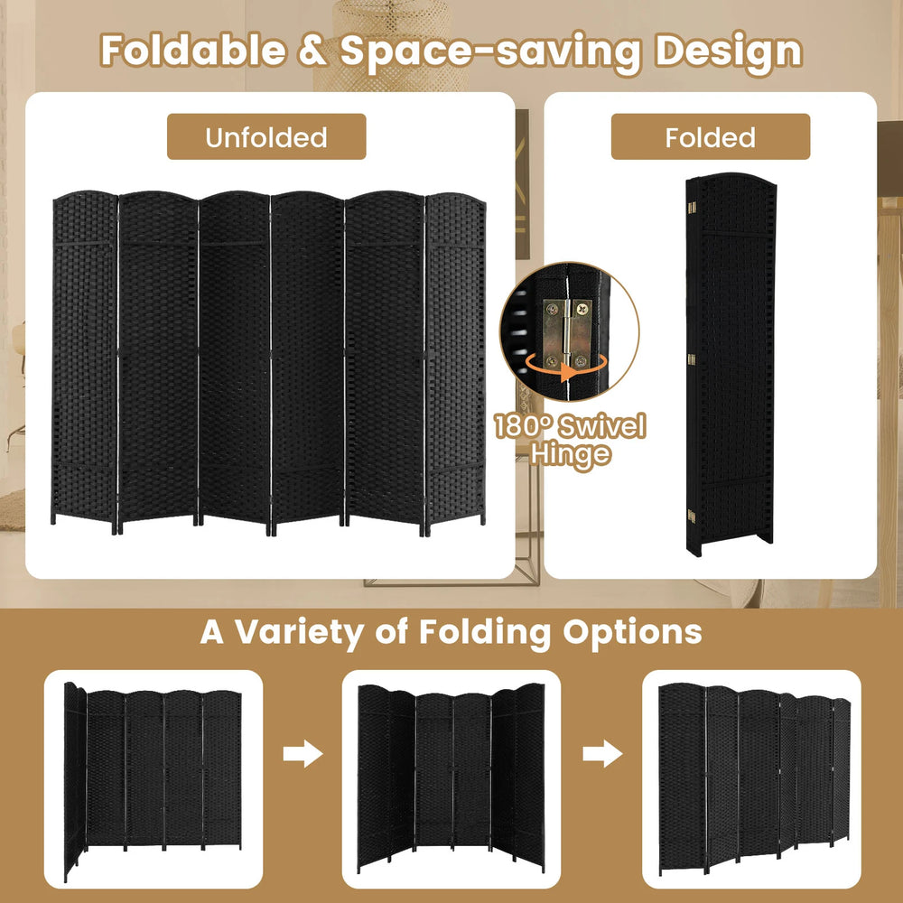 6-Panel Room Divider Folding Privacy Screen with Hand-woven Texture-Black