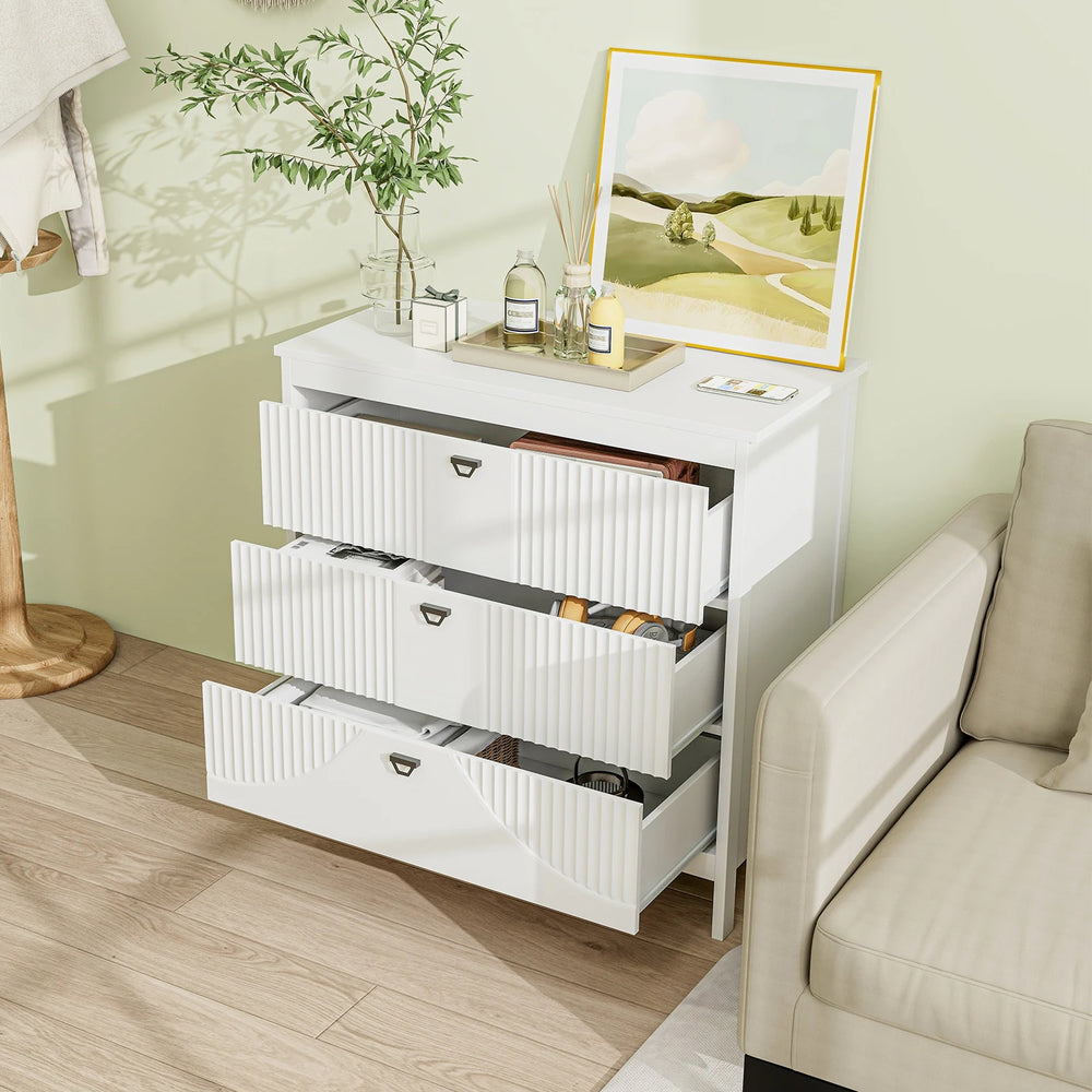 This 3-drawer dresser with great workmanship offers a perfect solution to declutter and enhance efficiency. Featuring three convenient pull-out drawers and a generous top surface, this storage cabinet provides ample space for organizing essentials while reducing mess. The thickened MDF and sturdy legs ensure lasting durability and can support up to 60 kg, guaranteeing a stable structure. Each drawer boasts high-quality metal slides for seamless operation, complemented by elegant handles that add a touch of sophistication to the design. Non-slip foot pads protect floors from scratches and add stability. With water-proof and smooth surfaces, maintenance is a breeze, offering a convenient and long-lasting furniture solution. Versatile and adaptable, this 3-drawer dresser seamlessly transitions from a sofa side table to a stylish office cabinet, catering to various needs. Bullet Point:Sufficient Storage Space: This chest of drawers offers a clutter-free solution with 3 convenient pull-out drawers, perfect for organizing essentials. The spacious top ensures easy access to all your belongings, reducing mess and enhancing efficiency. Stable Structure: This storage cabinet is made of thickened MDF for durability and dependability! Four sturdy legs hold up to 60 kg. Additionally, the cabinet is equipped with 2 anti-toppling devices that will help you secure the cabinet to the wall for added security. Better workmanship: Each drawer boasts high-quality metal slides for smooth operation, while elegant handles add a touch of sophistication. More, the non-slip foot pads protect your floors from scratches, ensuring both functionality and longevity of this chest of drawers. Suitable for Various Scenarios: This versatile nightstand functions seamlessly as a sofa side table, telephone stand, or stylish office cabinet, catering to a range of needs. Perfect for bedrooms, living rooms, dressing rooms, and offices, its adaptable design fits effortlessly in any space. Detailed Instructions and Easy Maintenance: The package will come with detailed instruction and all the necessary parts to help you set the chest up. Besides, the easy to clean surfaces is water-proof and smooth, making it easy for you to maintain it. Specifications:Colour: WhiteMaterial: MDF, Engineered WoodOverall Dimensions: 80 x 40 x 79 cm (L x W x H)Inner Size of Drawer: 69 x 34 x 13 cm (L x W x H)Height of the Legs: 10 cmWeight Capacity in Total: 60 kgNet Weight: 19 kg Package Includes:1 x Chest of Drawers1 x User Guide