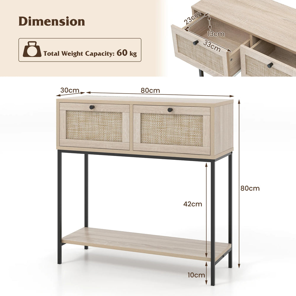 Rattan Console Table Boho Entryway Table with 2 Rattan Drawers and Open Storage Shelf-Oak