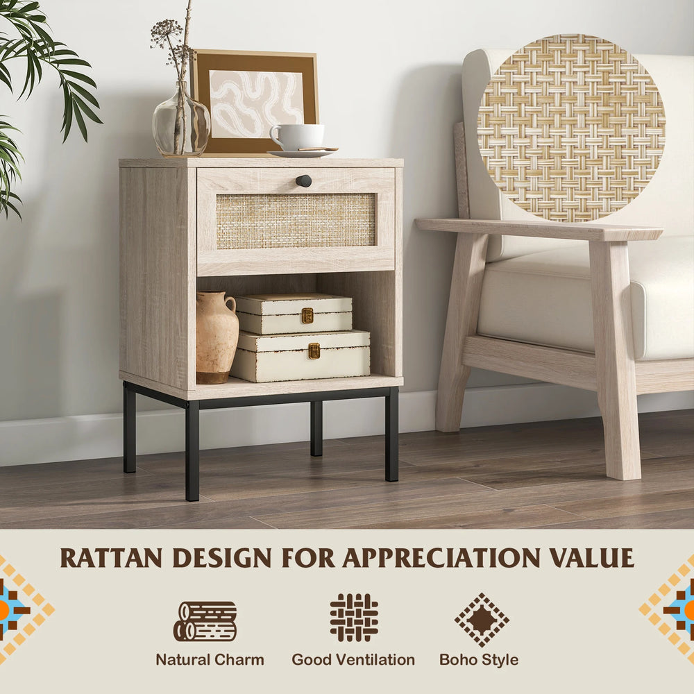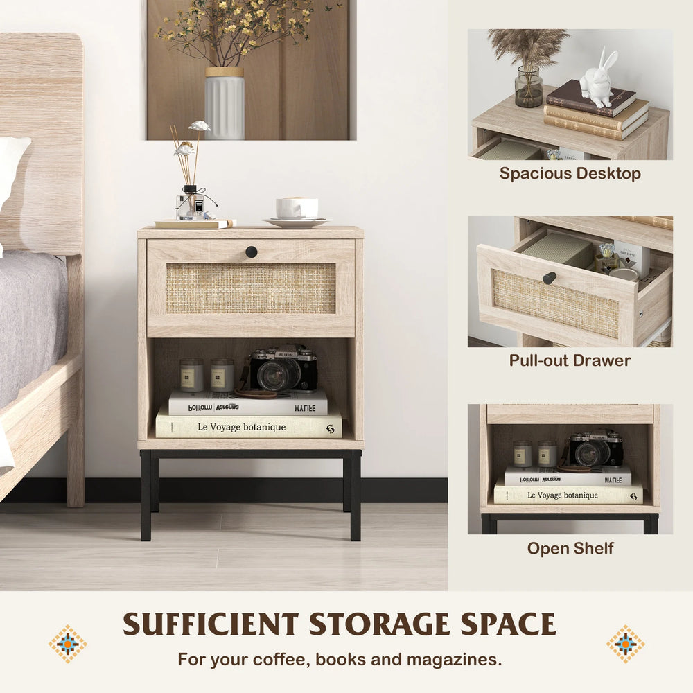 Rattan Nightstand Boho End Table with Rattan Drawer & Open Shelf-Oak