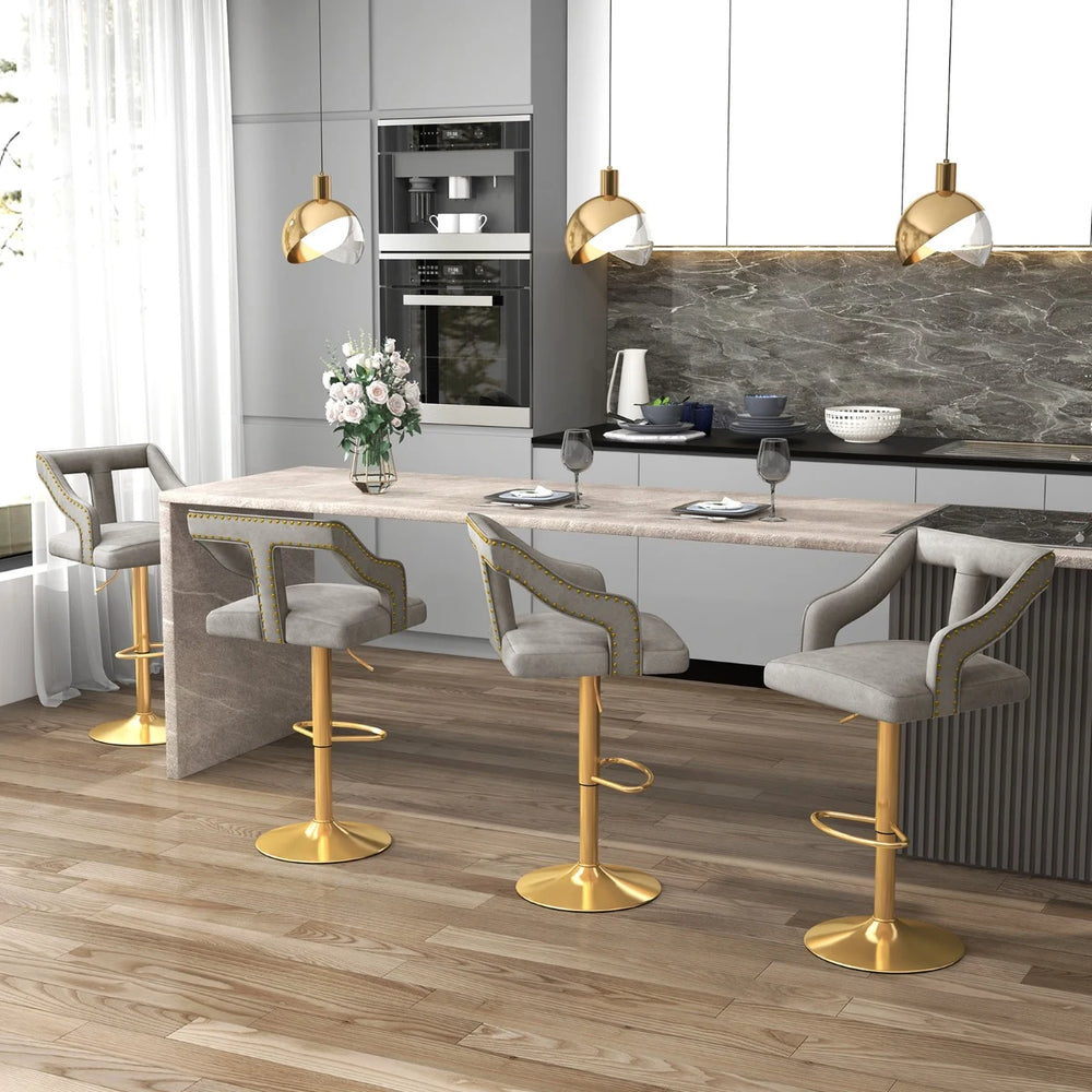 Color: Gray & Gold/Pink & Gold Material: Metal, Dutch Velvet, Sponge Overall Dimension: 18.5" x 20" x 35"-44"/47 x 50 x 89-111 cm (L x W x H) Size of Backrest: 18.5" x 11.5"/47 x 29 cm (L x H) Size of Seat: 18" x 16.5"/46 x 42 cm (L x W) Thickness of Seat: 3"/7.5 cm Height of Seat: 25"-34"/63-85 cm Height of Footrest: 9"-18"/22-44 cm Diameter of Base: 16.5"/42 cm Suitable Table Height: 35"-43"/89-110 cm Max Load Capacity: 330 lbs/150 kg Net Weight of Each Bar Chair: 19.5 lbs/9 kg Package Includes: 2 x Bar Chairs 1 x User Guide