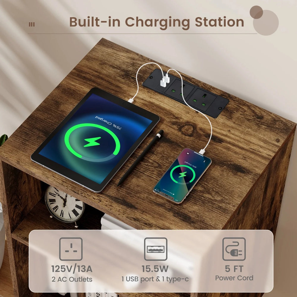 3-Tier Record Player Stand with Charging Station Shelf and 4 Dividers-Rustic Brown