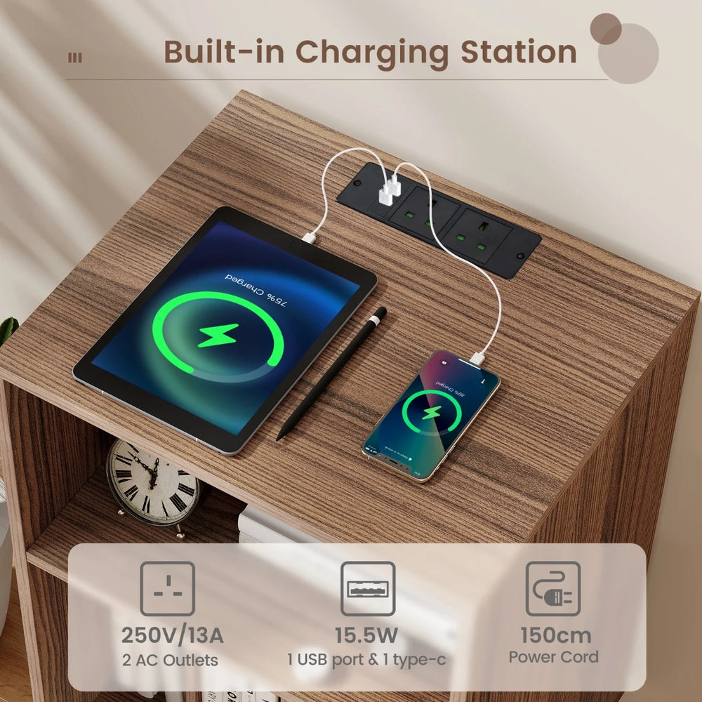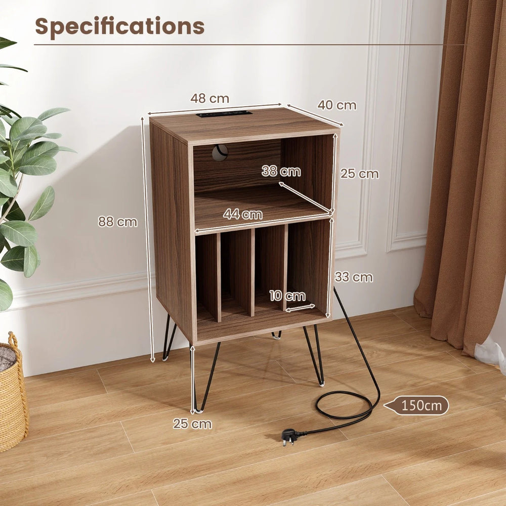 3-Tier Record Player Stand with Charging Station Shelf and 4 Dividers-Walnut