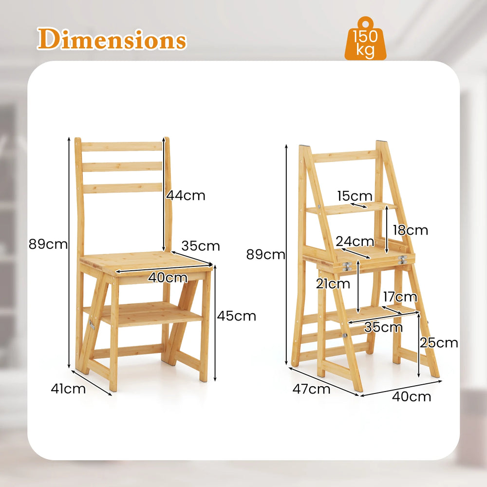 Color: Natural Material: Bamboo Ladder Dimensions: 47 x 40 x 89 cm (L x W x H) Chair Dimensions: 41 x 40 x 89 cm (L x W x H) Seat Size: 40 x 35 cm (L x W) Seat Height: 45 cm Weight Capacity: 150 kg Net Weight: 6 kg Package Includes: 1 x Folding Ladder Chair 1 x Instruction