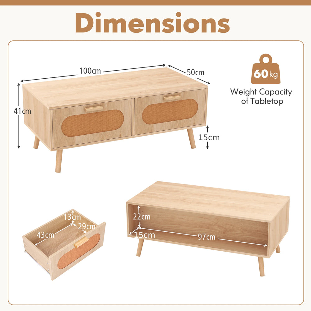 Rattan Coffee Table Mid Century Modern Center Table with 2 Storage Drawers-Natural
