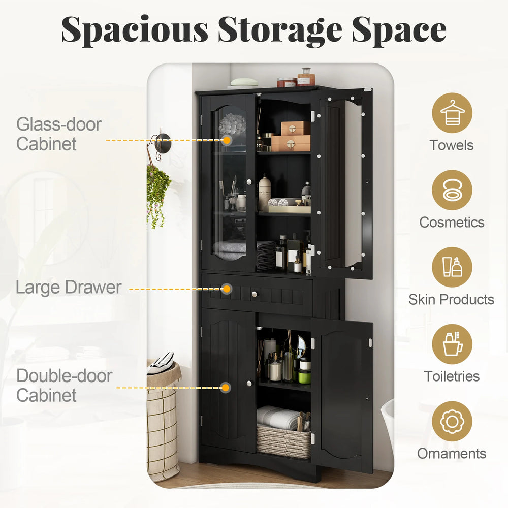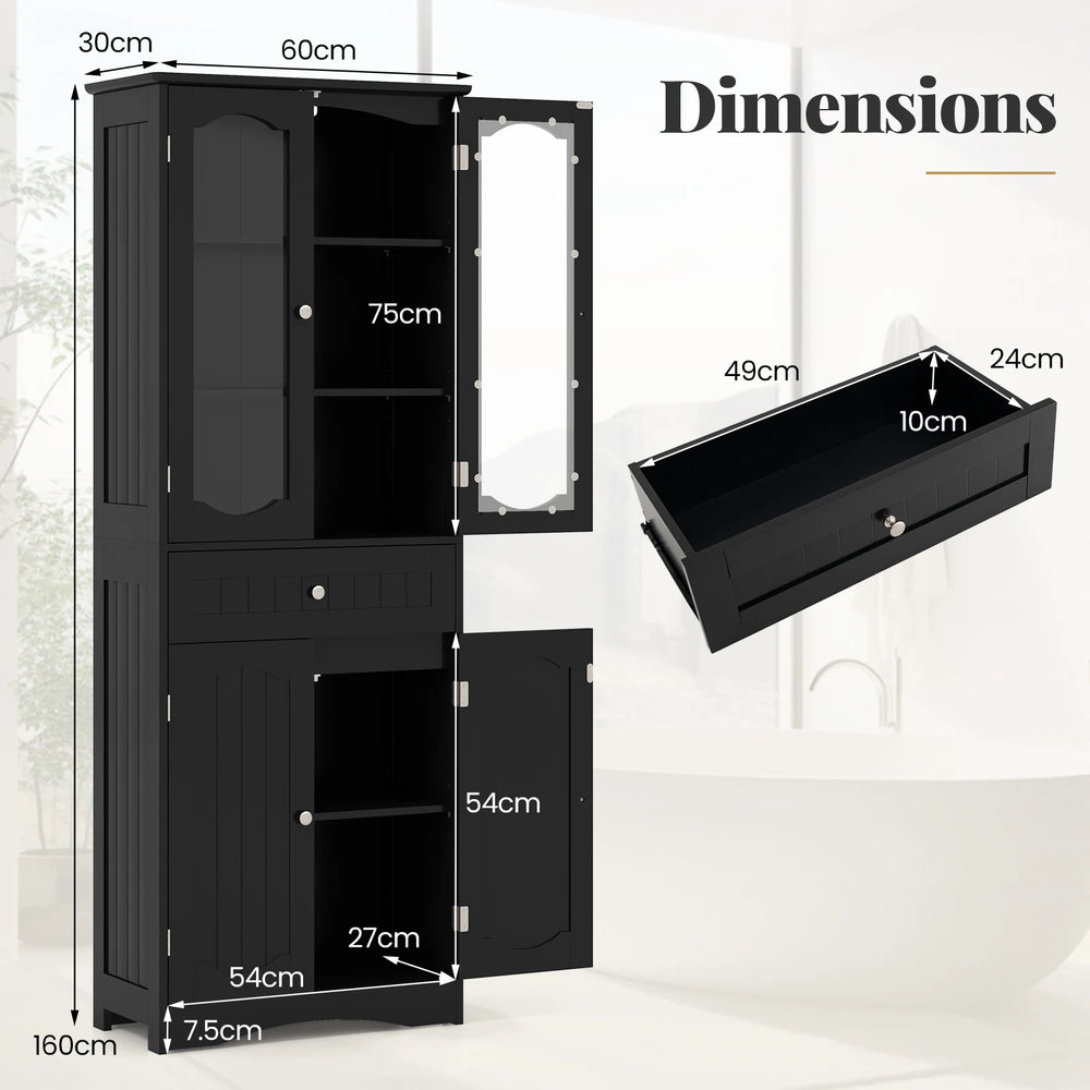 160cm Freestanding Linen Tall Bathroom Storage Cabinet with 2 Glass Doors-Black